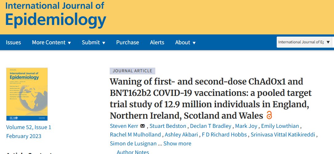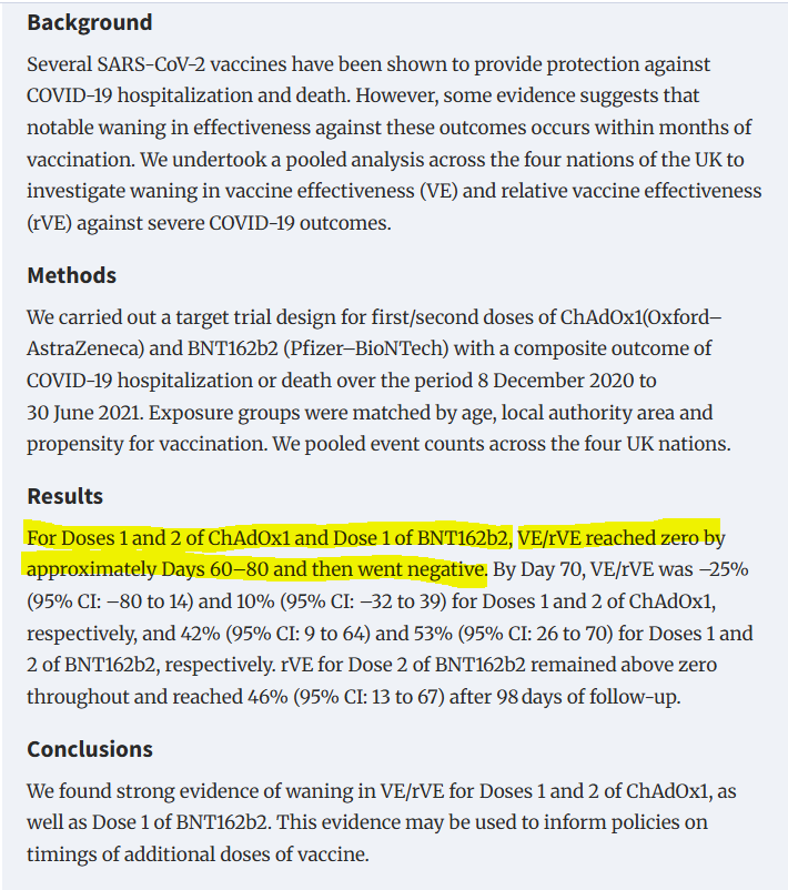 Item 5 - Vaccine ineffectiveness There were plenty of signs that the COVID vaccines were not effective in preventing infection, or transmission, or hospitalisation, or death with COVID, at a population level, just by comparing the rates before and after the introduction of the vaccines. The vaccine introduction in mid December 2020 coincided with an uptick in all of these variables. (What changed the trend was the appearance of the omicron variant which Bill Gates dolefully described as "a type of vaccine" which had done a better job of reaching the whole population than the vaccinators). But a study in the International Journal of Epidemiology gave evidence of something which we all observed anecdotally all around us: that vaccinated people were still becoming infected with the virus. The study found that after two doses of the Astra Zeneca vaccine or one dose of the Pfizer vaccine, that whatever immunity the vaccines delivered against the virus quickly waned and actually turned negative within 2-3 months (meaning recipients were more likely to be infected or hospitalised beyond that point). OurWorldInData link: https://ourworldindata.org/explorers/covid?pickerSort=asc&pickerMetric=location&Metric=Confirmed+deaths&Interval=Cumulative&Relative+to+population=true&country=~OWID_WRL International Journal of Epidemiology link https://academic.oup.com/ije/article/52/1/22/6770060?login=false 6/10