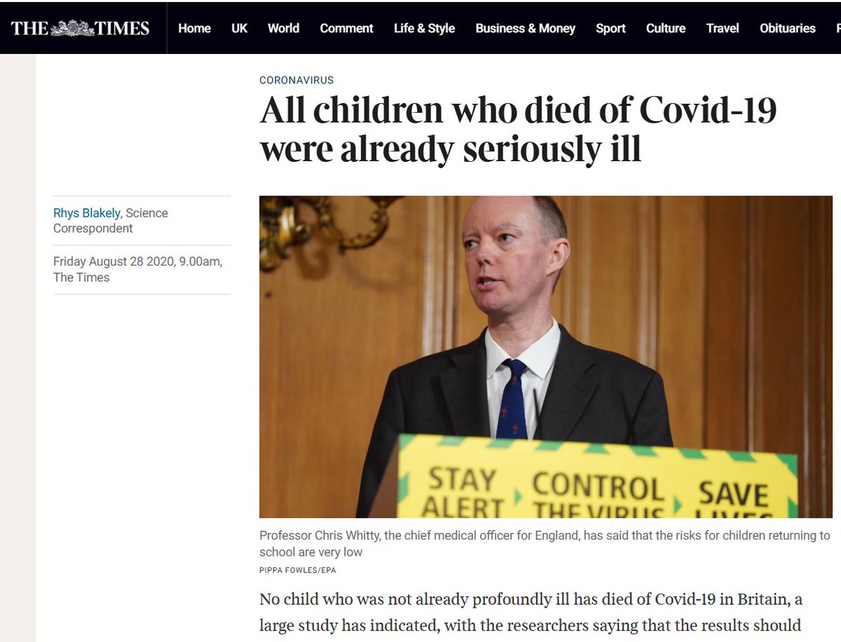 Item 6 - Risk to Children As we know, in 2020 schools across the UK were closed as part of the national lockdowns, with disastrous impact on education, particularly of the very young and those due to sit exams, and disastrous impact on working parents who had to somehow balance work and home schooling. However it was clear from very early days that children were at vanishingly small risk from the virus and that the risks to them of losing education (and the resultant isolation from their peers) would be far higher. An article in The Times discussed a study conducted on 260 hospitals in Britain in the first half of 2020 and concluded that "no child who was not already profoundly ill has died of Covid-19 in Britain" "The study looked at 260 hospitals in England, Wales and Scotland. Out of the 69,500 patients admitted with proven Covid-19 in the first six months of the year, 651 — or 0.9 per cent — were under 19 years of age". "Six deaths of minors were recorded. Three were newborn babies with other severe health problems. The other three were aged 15 to 18 years old and also had “profound health issues”. Callum Semple, professor in child health and outbreak medicine at the University of Liverpool and Alder Hey Children’s Hospital, who is the senior author of the study, said: “The deaths that we did observe were children with what we would describe as profound co-morbidities — not a touch of asthma, not cystic fibrosis.” These children’s underlying illnesses would have been considered as “life-limiting”, he said. “We did not have any deaths in otherwise healthy school-aged children.” However the authorities, and some in the teaching profession, were happy to let the illusion that children were at some risk from the virus to persist in order to promote their own agendas. Times article: https://www.thetimes.com/uk/healthcare/article/all-children-who-died-of-covid-19-were-already-seriously-ill-jlxr8mkxq 7/10