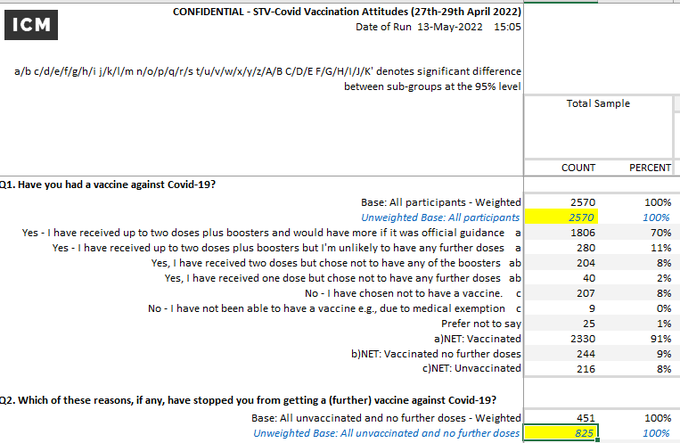 Item 8 - Exaggerating the numbers of people who were Vaccinated. We were led to believe by the media that we vaccine refuseniks were in a tiny minority - less than 10%. And this was used heavily as a tactic by the media and government to pressure everyone into being vaccinated. You'll remember all the pressure from the likes of Andrew Neil and Piers Morgan and Sajid Javed and Esther Rantzen and Anne McElvoy and Uncle Tom Cobley and all... But this 10% number was based on ONS data which relied on (old) estimates of the UK population. Meanwhile the Health Security Agency used data from NIMS, which has a record of everyone registered with the NHS, and it estimated that the proportion of the English population which had not received a vaccine, was 19.5%. And ICM ran an opinion poll for Scottish Television on a representative sample of the population which discovered that 32% of the sample (825 out of the 2570 participants) said they'd had no vaccines. But as identified by @profnfenton ICM were sufficiently astonished at this outcome that they decided to apply some "post-survey weighting" to their sample to bring the number down to the "correct" level of 8%. But it's clear that we unvaccinated are a sizeable minority - far more than 10%. And the government knew this too, which is why they eventually recoiled from making the vaccines mandatory in the NHS (and probably in other roles too). BBC https://www.bbc.co.uk/news/health-55274833 ICM poll, Prof Fenton analysis: https://www.youtube.com/watch?v=ccWOMtmH65U 9/10