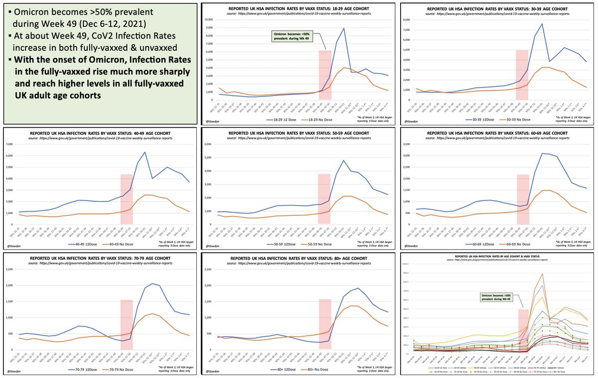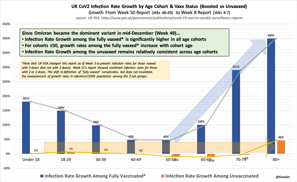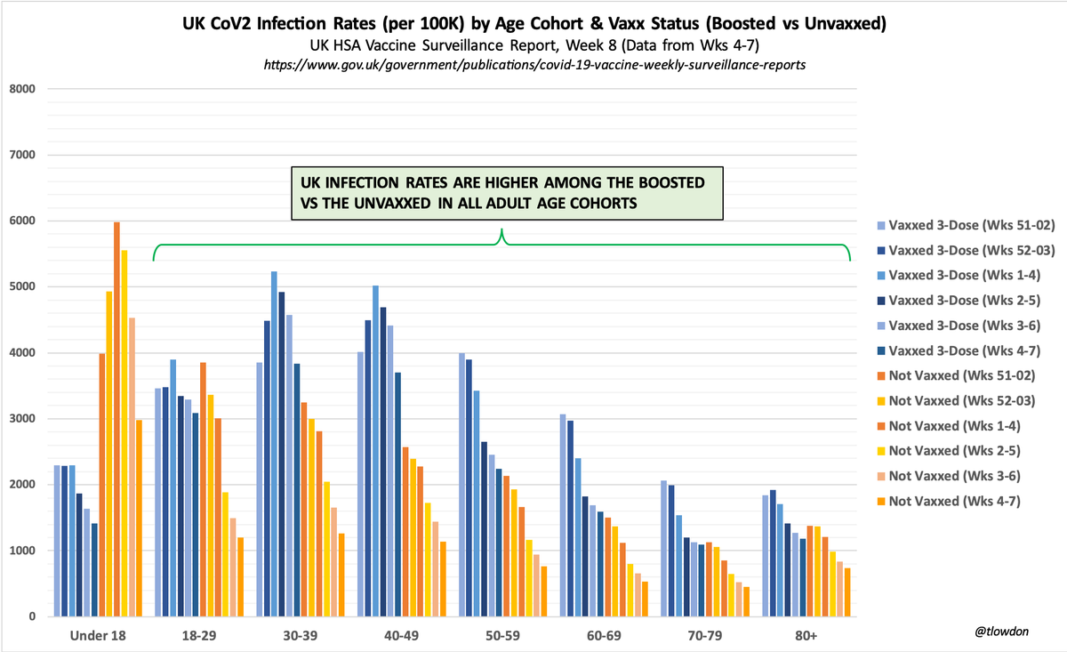 2.24.22: UK infection rates, since Omicron arrived, rose much faster among the boosted vs the unvaxxed & remain higher in all boosted adult cohorts. Both boosted & unvaxxed continue to get infected & spread - and in adults, the boosted much more so - invalidating vaxx mandates.