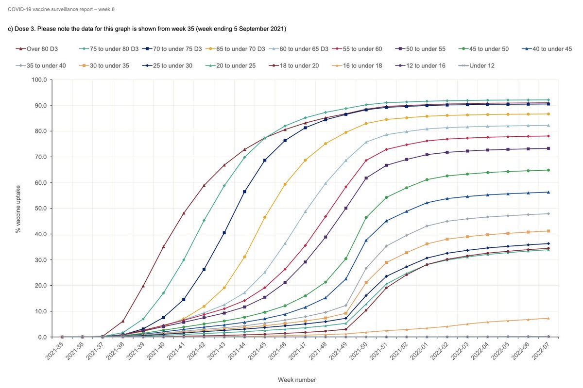 UK booster uptake continues to taper off in recent weeks, but all age cohorts above 40 y.o. are now >50% boosted.