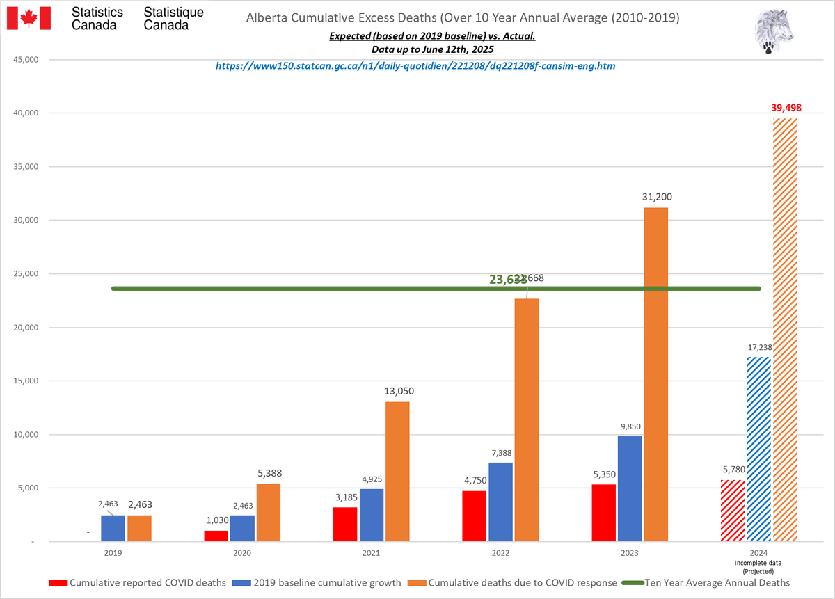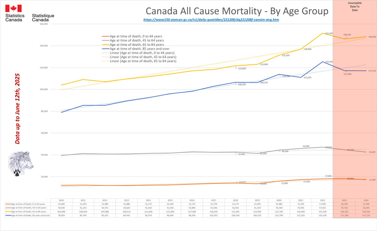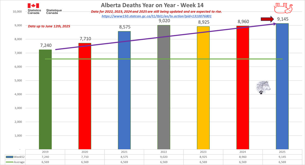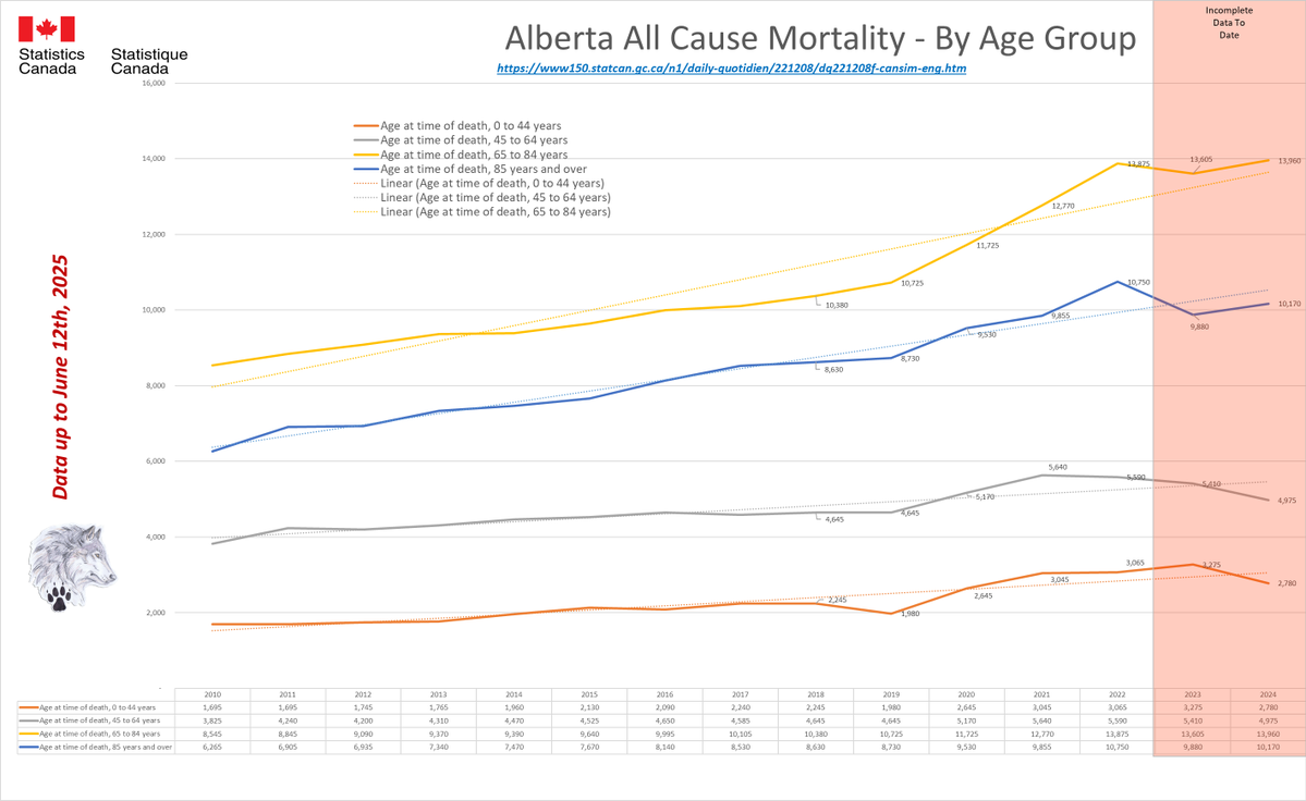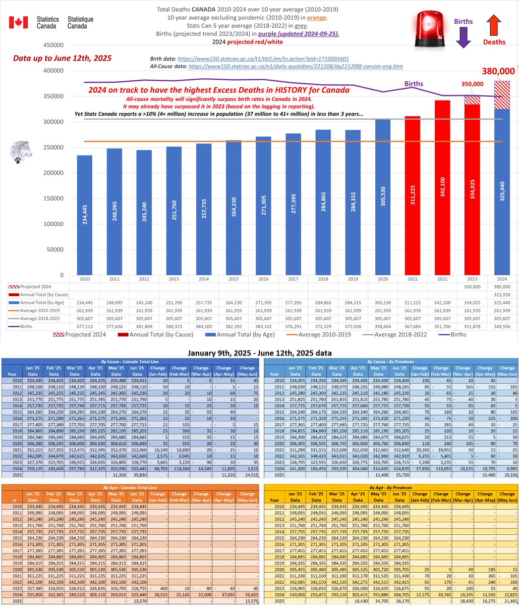 🚨ALL-CAUSE MORTALITY DATA – CANADA Stats Canada Data as of June 12, 2025 All provinces lag reporting for 2023/24/25. Many still modify data as far back as 2010. AB, BC, N&L, NWT, PEI & QC reported to Week 14, 2025. MN to Week 12, 2025. SK to Week 13, 2025. Canada to Week 2, 2025. Alberta's 2025 all-cause death data is ALARMING: 25% spike over 2020 by April, on track for a 46% surge by year-end. Over 50,000 excess deaths vs pre-pandemic avg. The two primary reporting tables (“By Cause” and “By Age”) differ significantly. From January 2025 to June 2025 (5 months) Canada All Cause mortality numbers swung from a low of 183,420 to a high of 325,445 just for 2024. Even 2010 saw from minus 640 to plus 600 deaths (by cause) and changed the cause of death in up to 367,225 people since 2010 and up to 243,190 people in the 2024 data alone. In 2020, Canada was shut down due to daily ‘CONFIRMED’ COVID deaths. Yet, in 2025, Canada is still unable to provide semi-accurate death data from month to month going back 15 YEARS. Since January 2025, Canada removed up to 30% of the reported deaths, then increased the total by almost 60% just for 2024. This is NOT the same reclassification issue as “UNKNOWN CAUSE”. Deaths, especially in the younger population, are increasing. In 2024, deaths over 65 have started to increase again. These are not deaths being driven by immigration or the “baby boomers”. Canada is not importing dead bodies and ‘boomers’ won’t significantly impact All-Cause mortality for another 5-20 years based on current life expectancy. ALL 2024 provincial data show this will only get worse from here. 2024 WILL be the worst on record for All-Cause deaths in Canada & we have still not seen a reset for premature excess deaths since 2019. Whatever is causing these excess deaths is still happening (and it isn’t COVID). https://dksdata.com/ExcessDeaths#CanadaExcessDeaths https://dksdata.com/Excess/AllCauseCanadaJun2025.pdf (full report 96 pages) https://dksdata.com/Excess/CompareJan25-June25-ByCause.pdf (large file 2,308 pages) https://dksdata.com/Excess/CompareJan25-June25-ByAge.pdf (large file 1,969 pages) 2/15