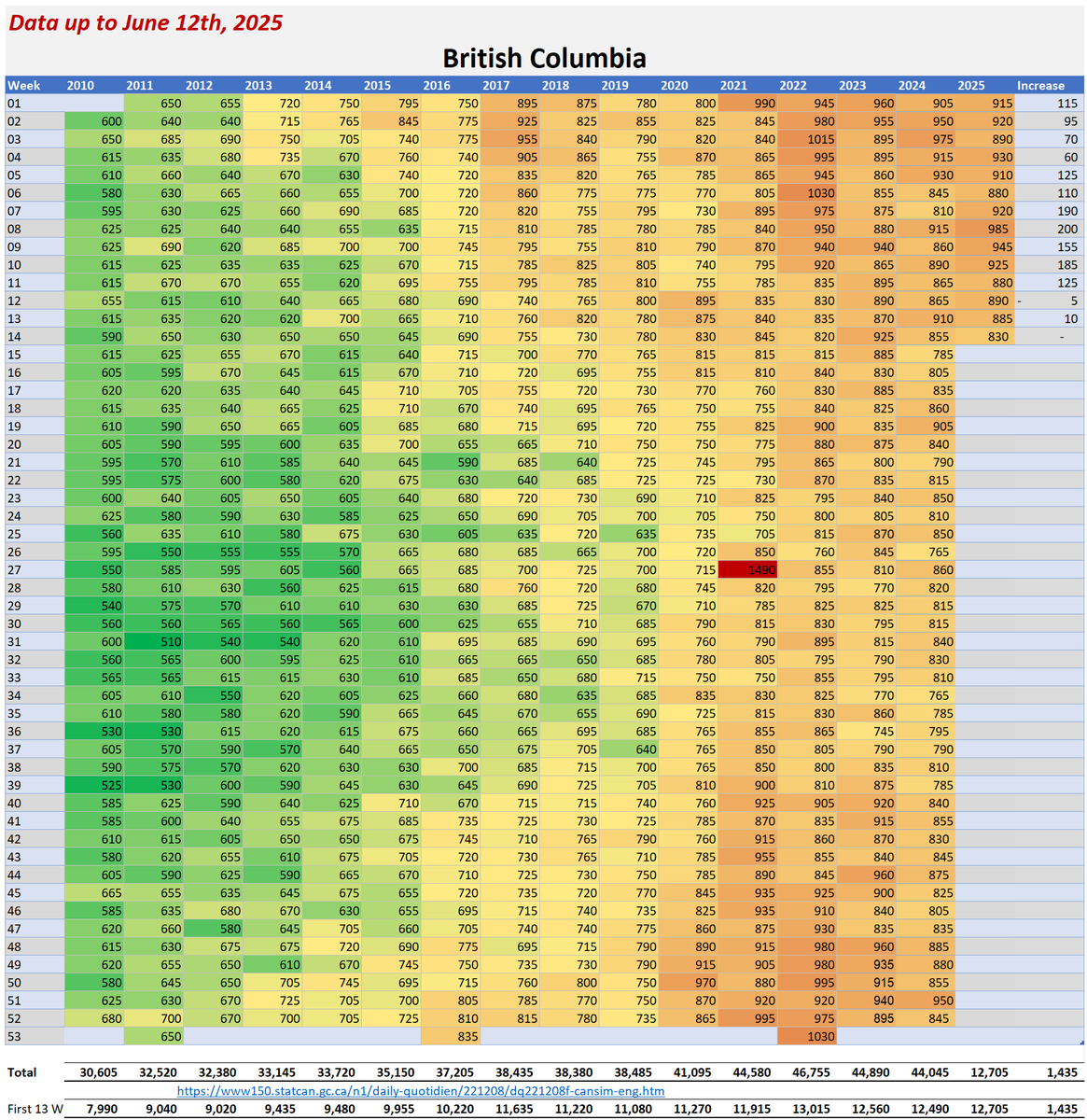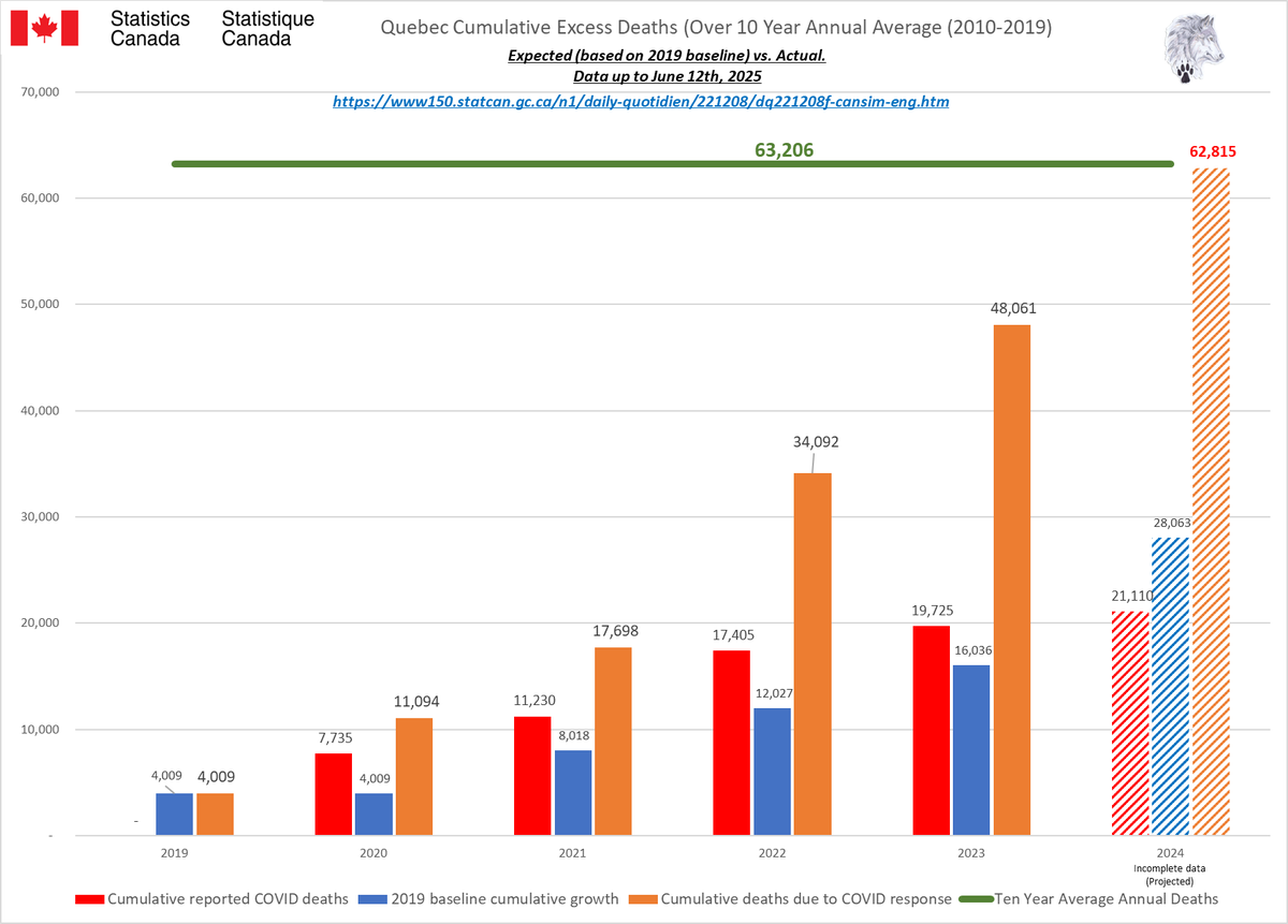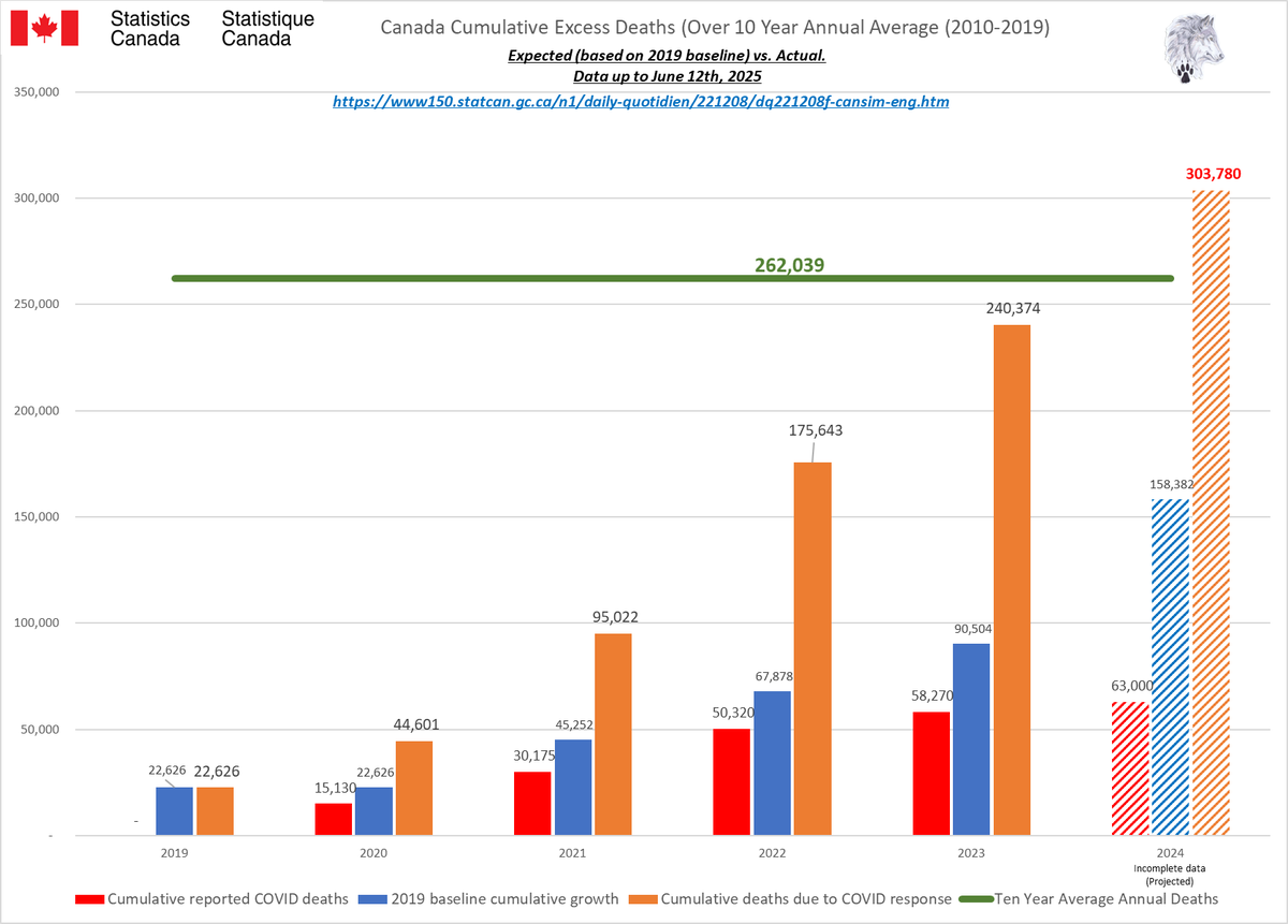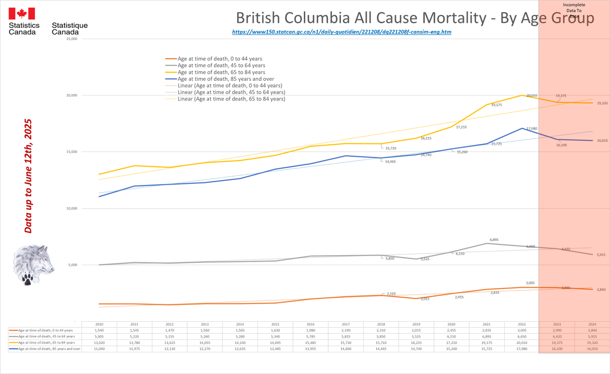 🚨ALL-CAUSE MORTALITY DATA – CANADA Stats Canada Data as of June 12, 2025 All provinces lag reporting for 2023/24/25. Many still modify data as far back as 2010. AB, BC, N&L, NWT, PEI & QC reported to Week 14, 2025. MN to Week 12, 2025. SK to Week 13, 2025. Canada to Week 2, 2025. Alberta's 2025 all-cause death data is ALARMING: 25% spike over 2020 by April, on track for a 46% surge by year-end. Over 50,000 excess deaths vs pre-pandemic avg. The two primary reporting tables (“By Cause” and “By Age”) differ significantly. From January 2025 to June 2025 (5 months) Canada All Cause mortality numbers swung from a low of 183,420 to a high of 325,445 just for 2024. Even 2010 saw from minus 640 to plus 600 deaths (by cause) and changed the cause of death in up to 367,225 people since 2010 and up to 243,190 people in the 2024 data alone. In 2020, Canada was shut down due to daily ‘CONFIRMED’ COVID deaths. Yet, in 2025, Canada is still unable to provide semi-accurate death data from month to month going back 15 YEARS. Since January 2025, Canada removed up to 30% of the reported deaths, then increased the total by almost 60% just for 2024. This is NOT the same reclassification issue as “UNKNOWN CAUSE”. Deaths, especially in the younger population, are increasing. In 2024, deaths over 65 have started to increase again. These are not deaths being driven by immigration or the “baby boomers”. Canada is not importing dead bodies and ‘boomers’ won’t significantly impact All-Cause mortality for another 5-20 years based on current life expectancy. ALL 2024 provincial data show this will only get worse from here. 2024 WILL be the worst on record for All-Cause deaths in Canada & we have still not seen a reset for premature excess deaths since 2019. Whatever is causing these excess deaths is still happening (and it isn’t COVID). https://dksdata.com/ExcessDeaths#CanadaExcessDeaths https://dksdata.com/Excess/AllCauseCanadaJun2025.pdf (full report 96 pages) https://dksdata.com/Excess/CompareJan25-June25-ByCause.pdf (large file 2,308 pages) https://dksdata.com/Excess/CompareJan25-June25-ByAge.pdf (large file 1,969 pages) 2/15