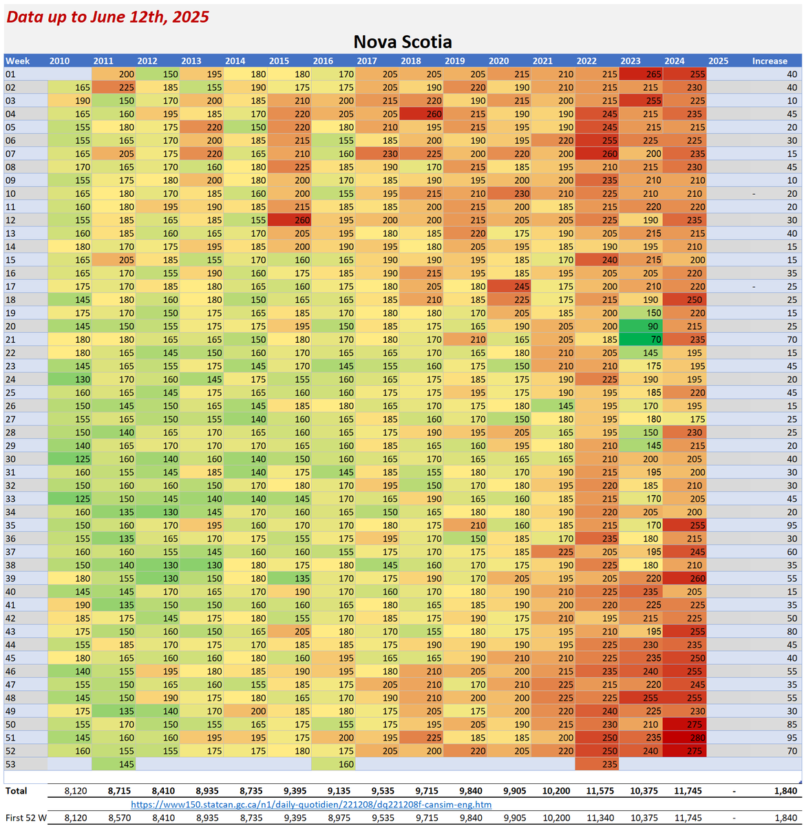 🚨ALL-CAUSE MORTALITY DATA – NOVA SCOTIA Stats Canada Data as of June 12, 2025 https://dksdata.com/ExcessDeaths#CanadaExcessDeaths https://dksdata.com/Excess/AllCauseCanadaJun2025.pdf (full report 96 pages) https://dksdata.com/Excess/CompareJan25-June25-ByCause.pdf (large file 2,308 pages) https://dksdata.com/Excess/CompareJan25-June25-ByAge.pdf (large file 1,969 pages) 11/15