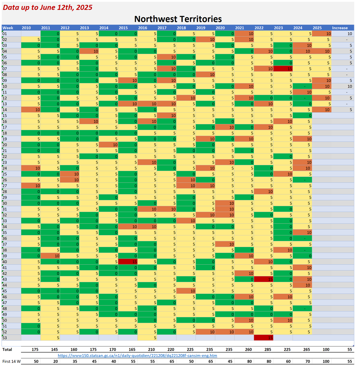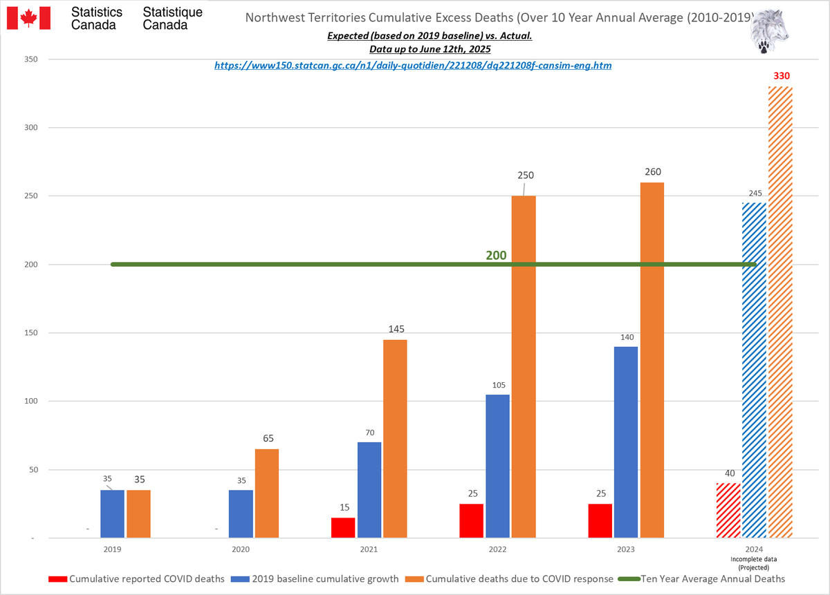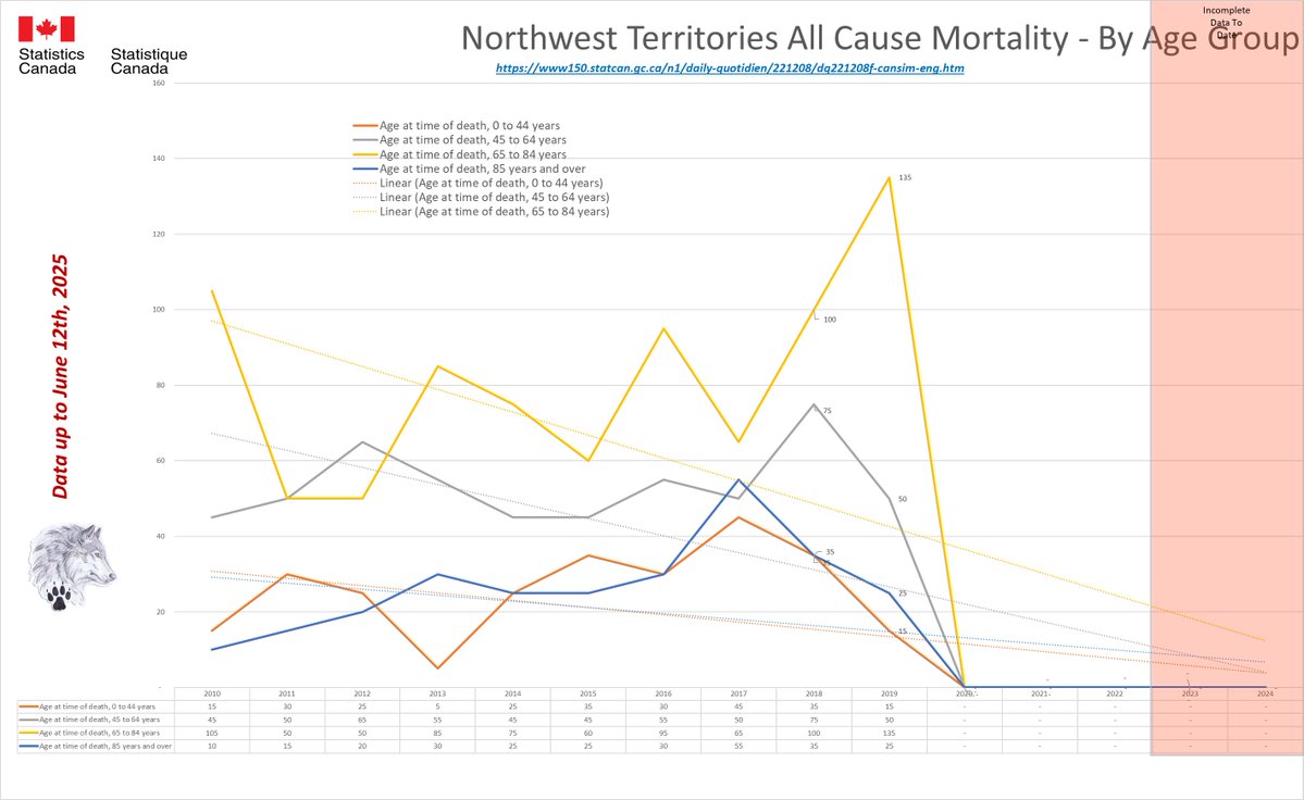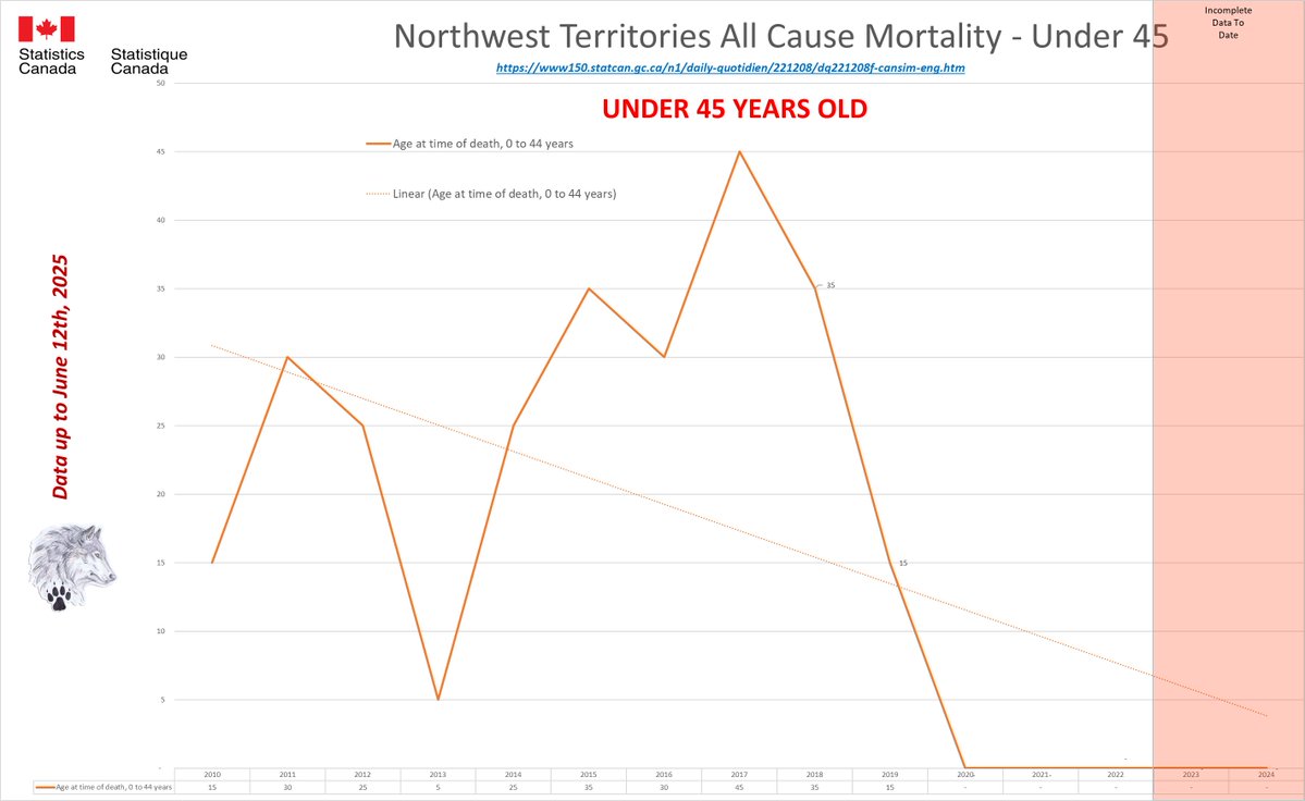 🚨ALL-CAUSE MORTALITY DATA – NORTHWEST TERRITORIES Stats Canada Data as of June 12, 2025 https://dksdata.com/ExcessDeaths#CanadaExcessDeaths https://dksdata.com/Excess/AllCauseCanadaJun2025.pdf (full report 96 pages) https://dksdata.com/Excess/CompareJan25-June25-ByCause.pdf (large file 2,308 pages) https://dksdata.com/Excess/CompareJan25-June25-ByAge.pdf (large file 1,969 pages) 12/15
