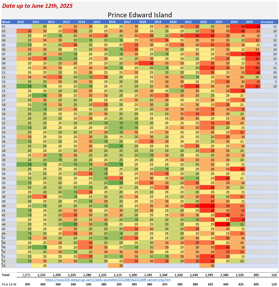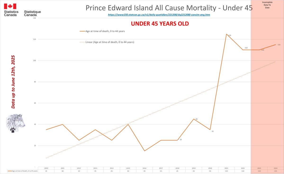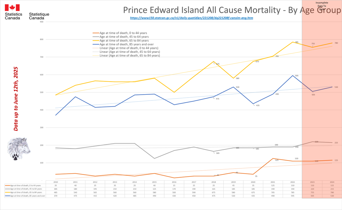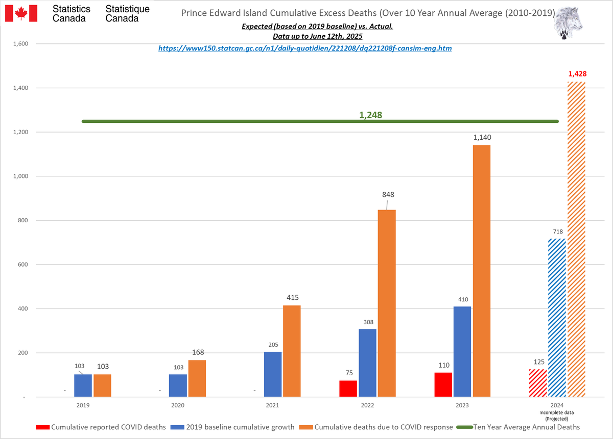🚨ALL-CAUSE MORTALITY DATA – PRINCE EDWARD ISLAND Stats Canada Data as of June 12, 2025 https://dksdata.com/ExcessDeaths#CanadaExcessDeaths https://dksdata.com/Excess/AllCauseCanadaJun2025.pdf (full report 96 pages) https://dksdata.com/Excess/CompareJan25-June25-ByCause.pdf (large file 2,308 pages) https://dksdata.com/Excess/CompareJan25-June25-ByAge.pdf (large file 1,969 pages) 14/15