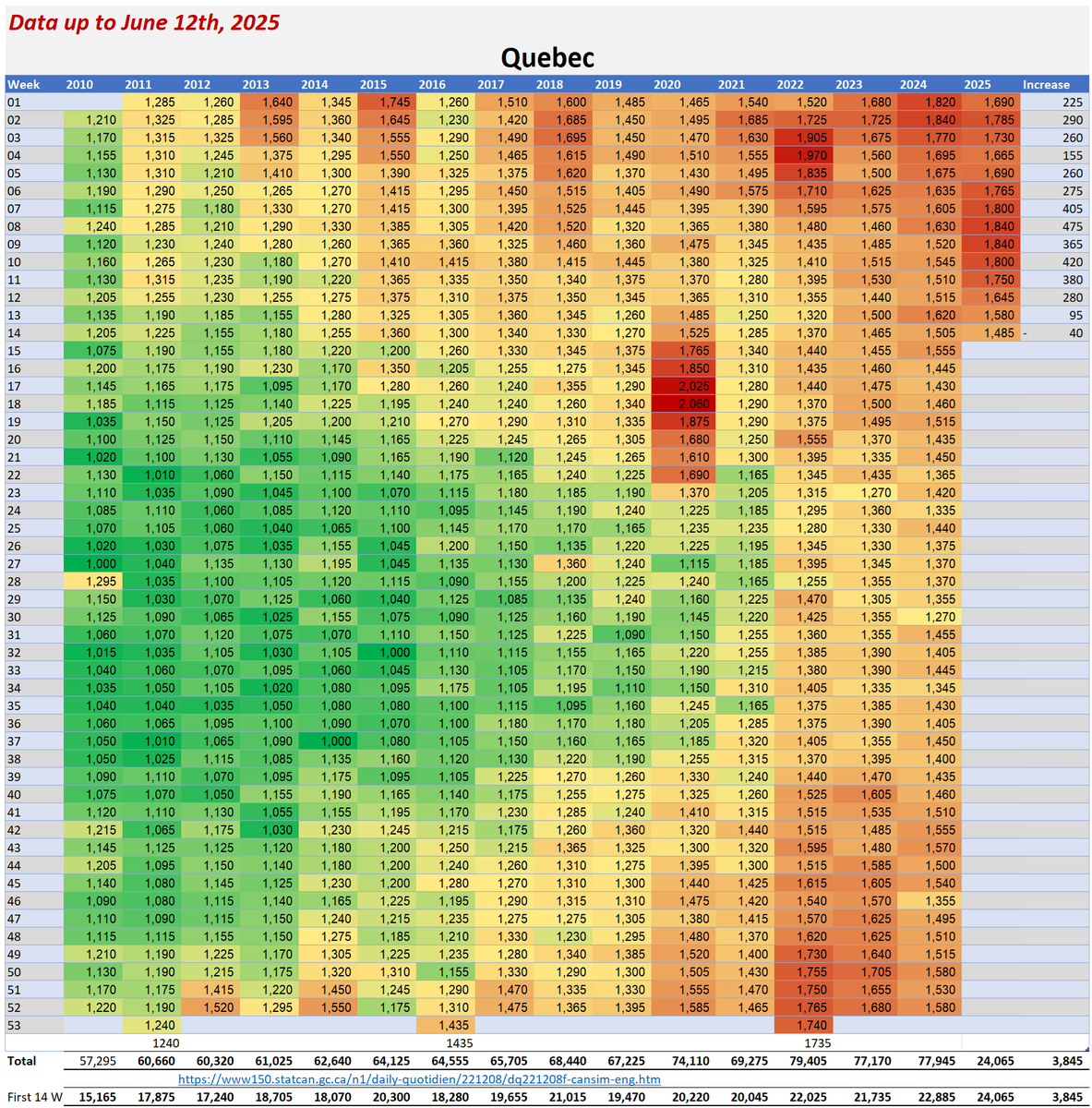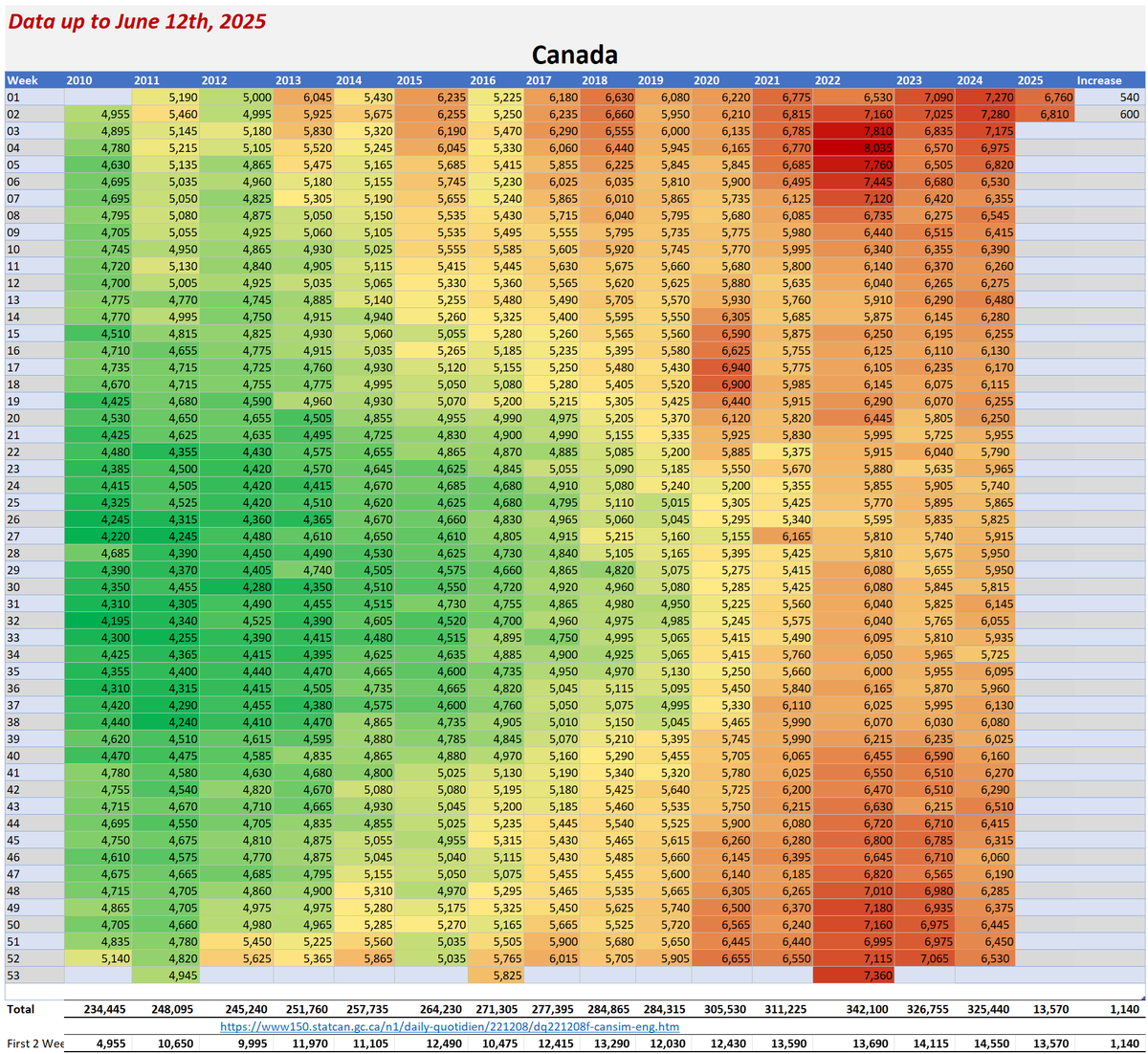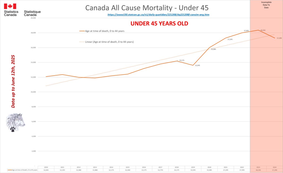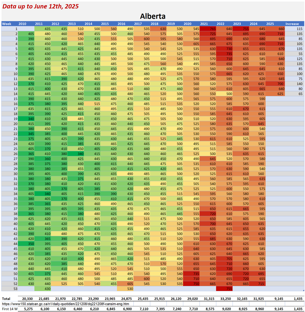🚨SHOCKING CANADA MORTALITY DATA Stats Canada’s latest numbers (June 12, 2025) reveal a CRISIS: Alberta’s 2025 all-cause deaths SPIKED 25% over 2020 by April, on track for a 46% SURGE by year-end. Over 50,000 EXCESS deaths vs pre-pandemic average. 2024 data swings wildly: Jan-June shows 183,420 to 325,445 deaths for 2024 alone. Even 2010 data was altered by up to 367,225 reclassified causes! Young people are dying at alarming rates. 2024 saw rising deaths over 65 too. This ISN’T immigration or “boomers.” Something ELSE is driving this. 2024 will be Canada’s WORST year for all-cause deaths EVER. Excess deaths haven’t slowed since 2019. Whatever’s causing this ISN’T COVID. Why is Canada’s death data so inconsistent? Why are excess deaths STILL climbing? WAKE UP, CANADA! Share this NOW! #CanadaMortality #ExcessDeaths 1/15