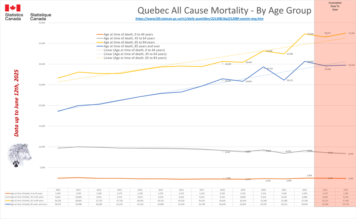 🚨 ALL-CAUSE MORTALITY DATA – QUEBEC Stats Canada Data as of June 12, 2025 https://dksdata.com/ExcessDeaths#CanadaExcessDeaths https://dksdata.com/Excess/AllCauseCanadaJun2025.pdf (full report 96 pages) https://dksdata.com/Excess/CompareJan25-June25-ByCause.pdf (large file 2,308 pages) https://dksdata.com/Excess/CompareJan25-June25-ByAge.pdf (large file 1,969 pages) 8/15
