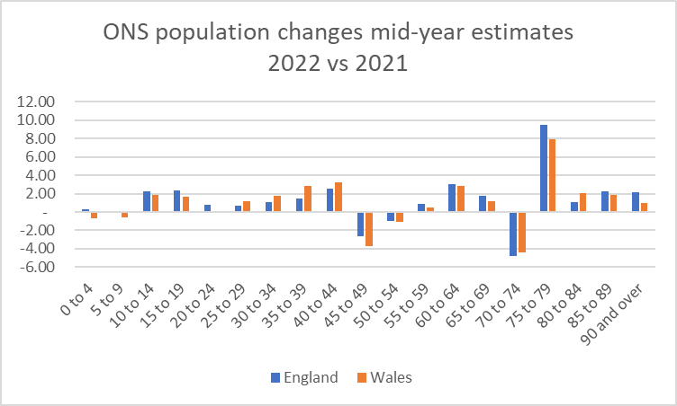 Here's what ONS says happened to our population between 2021 and 2022. They're claiming 10% more 75-79 year olds in England in a year in England. 54,375 to be precise.