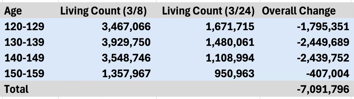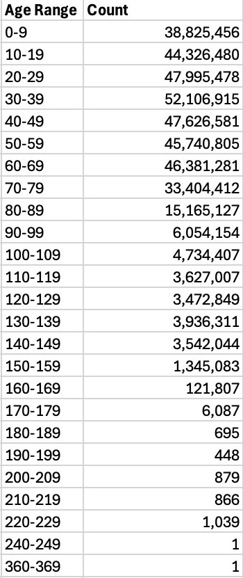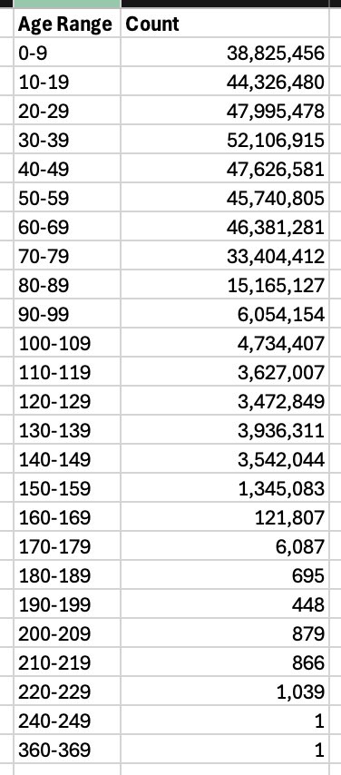This is beyond anything I could possibly imagine! All this corruption. So 90-99 over 6 million people. Almost 48 million are 100-109 years old. That’s not even the end of it . Just blows my mind. 1 person was even 360 years old https://t.co/zPXnnZYrLc