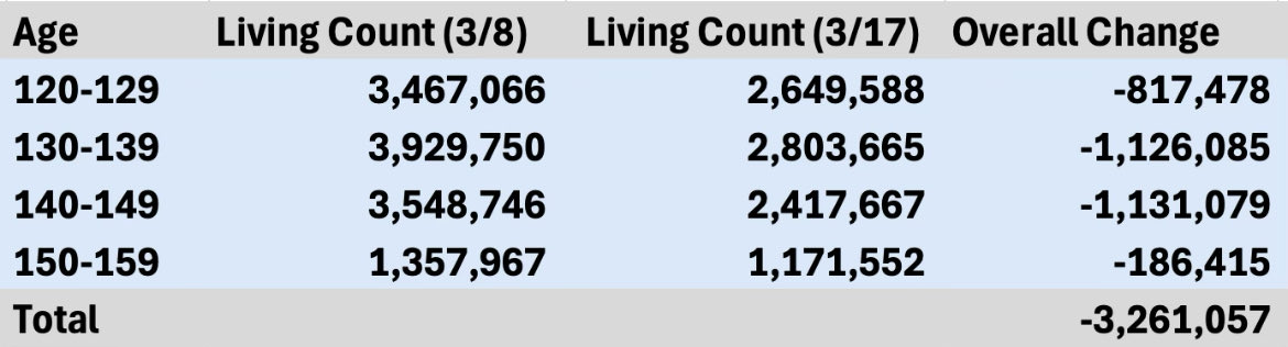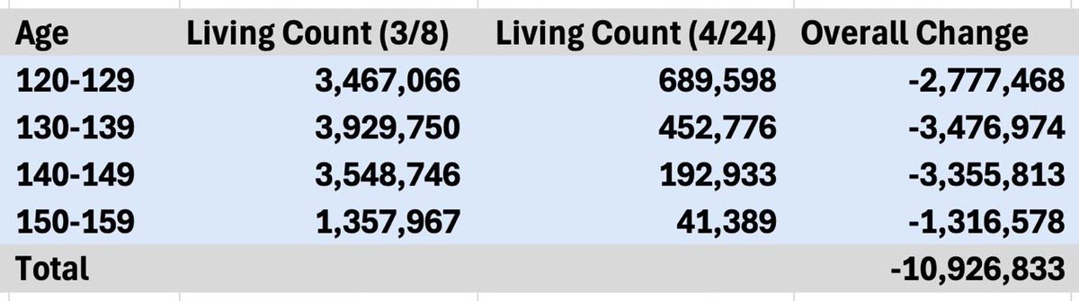 According to the Social Security database, these are the numbers of people in each age bucket with the death field set to FALSE! Maybe Twilight is real and there are a lot of vampires collecting Social Security 🤣🤣 https://t.co/ltb06VX98Z