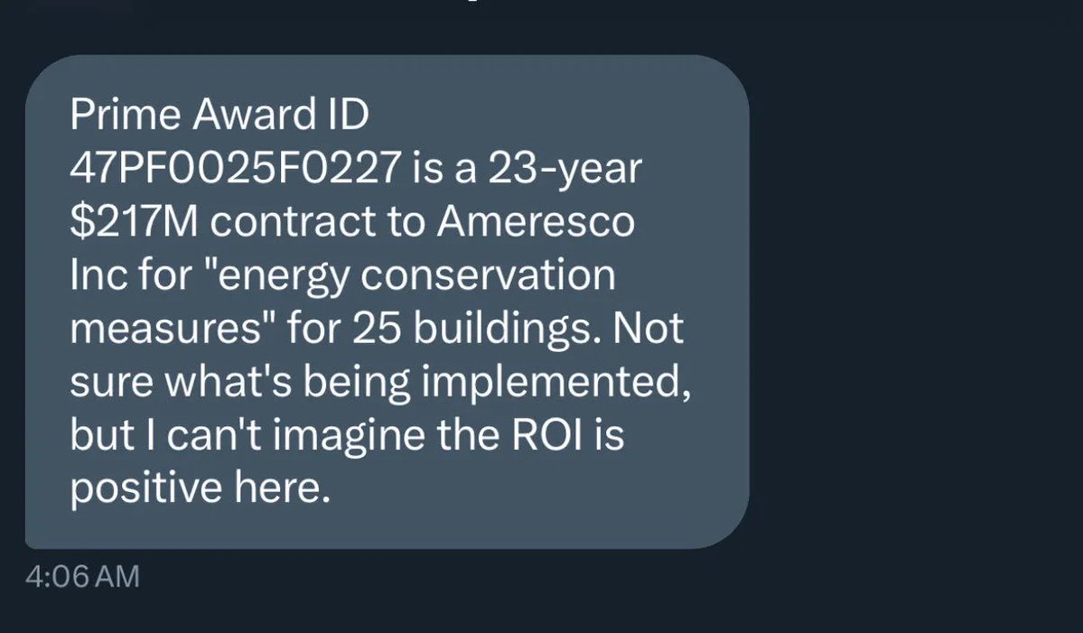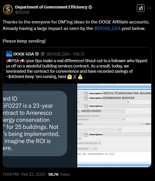 🚨 🇺🇸 DOGE CANCELS $217M CONTRACT AFTER CITIZEN TIP, SAVES $40M! DOGE's crowdsourcing strategy pays off: A follower's tip led to termination of a questionable 23-year, $217M "energy conservation" contract for just 25 buildings. Team Elon says this proves the power of public oversight. When Americans spot government waste, DOGE acts—and the savings add up fast. Source: @DOGE_GSA @DOGE