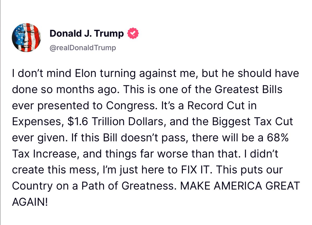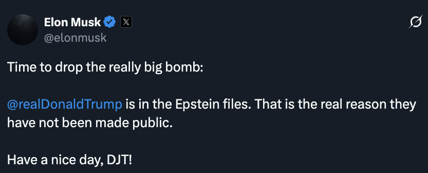BREAKING: President Trump responds after Elon Musk accused him of being in the Epstein files. "I don't mind Elon turning against me, but he should have done so months ago..." https://t.co/HZPpPki3hn