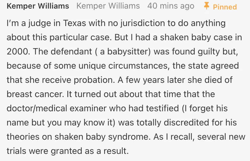 This Texas judge for example recognizes how unjust this case is: "I'm a judge in Texas with no jurisdiction to do anything about this particular case. But I had a shaken baby case in 2000. The defendant (a babysitter) was found guilty but, because of some unique circumstances, the state agreed that she receive probation. A few years later she died of breast cancer. It turned out about that time that the doctor/medical examiner who had testified (I forget his name but you may know it) was totally discredited for his theories on shaken baby syndrome. As I recall, several new trials were granted as a result."