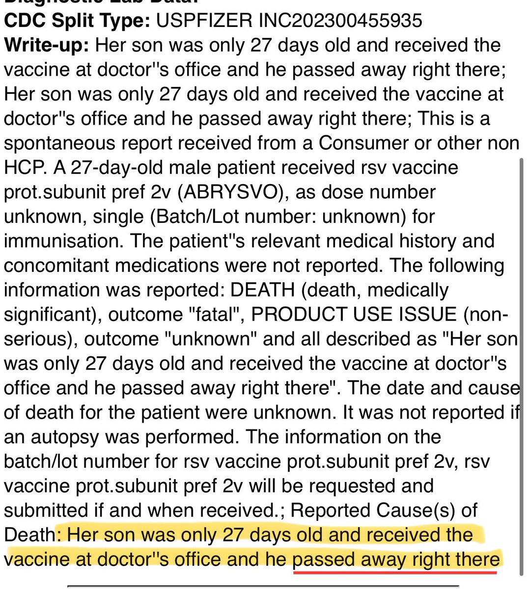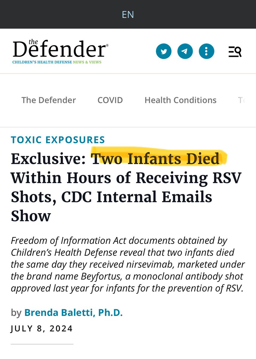 CHD obtained docs via foia and just published a piece on this death and another infant girl.👇🏻 https://childrenshealthdefense.org/defender/infant-deaths-rsv-shot-foia-vaers-nirsevimab-beyfortus/?utm_source=luminate&utm_medium=email&utm_campaign=defender&utm_id=20240708