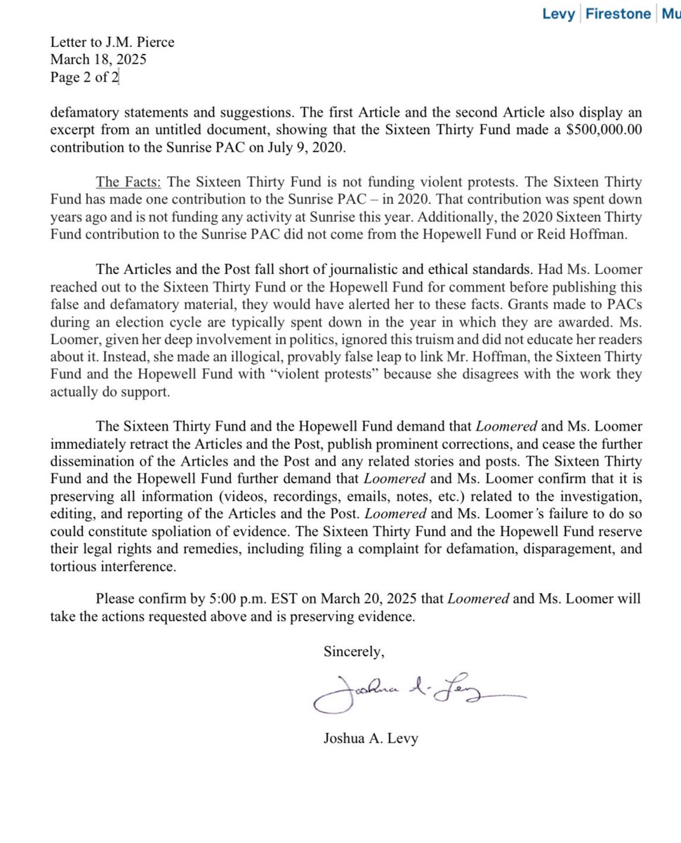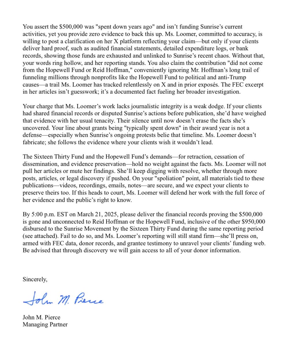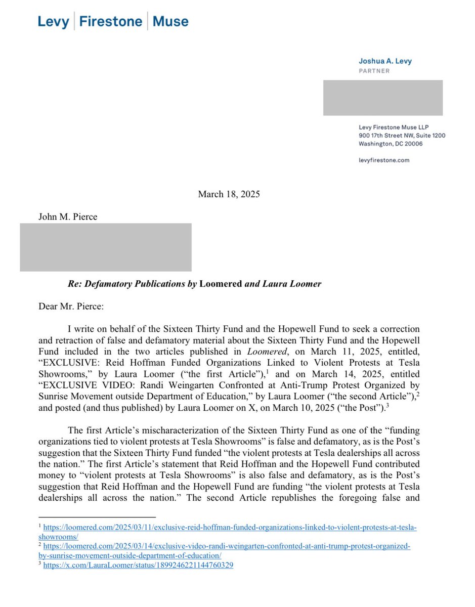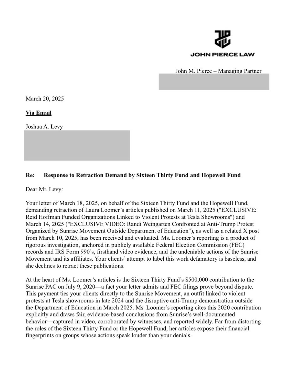 BREAKING: My lawyer @johnmarkpierce and I just responded to Joshua Levy @joshlevyesq, the lawyer who has been hired by the Soros funded Hopewell Fund and Sixteen Thirty Fund to threaten to sue me as a way to silence my investigative reporting about their financial support of the @sunrisemvmt, which is the radical Marxist group behind the violent @Tesla Takedown protests. It’s worth noting that Joshua Levy was previously hired to represent @HunterBiden, and Fusion GPS when the Democrats were staging the Russia collusion hoax against President @realDonaldTrump . Joshua Levy is a Democrat political lawfare operative and he’s been hired to silence me and my investigative reporting regarding the violent @Tesla Takedown protests that I have been exposing. Please see the letter below that my attorney has replied with. I will NOT be retracting my investigative reporting about Jeffery Epstein associate and @LinkedIn founder @reidhoffman and his funding of Soros allied groups affiliated with the violent Tesla Takedown protests across the nation and around the world in an effort to attack President Trump and @elonmusk. I am prepared to FIGHT FIGHT FIGHT this battle and I stand by my reporting, even if that means going to trial with @georgesoros’s Left wing slush funds and Reid Hoffman, who also funded the lawfare against President Trump. Through discovery, I will gain access to the financial and donor records of the Hopewell Fund and the Sixteen Thirty Fund, in addition to their affiliates if this is the route they wish to take with me. In preparation, I have launched a LAURA LOOMER LAWFARE FUND where people can help support my legal fees and legal war chest that I will need if I am to continue exposing these Tesla Takedown protests and the funding networks behind the Democrat’s domestic terror operations in our nation. Please read my reply letter, and donate to my legal defense fund on @GiveSendGo here! 👇🏻 Thank you! I appreciate your support! givesendgo.com/LoomerLawfare