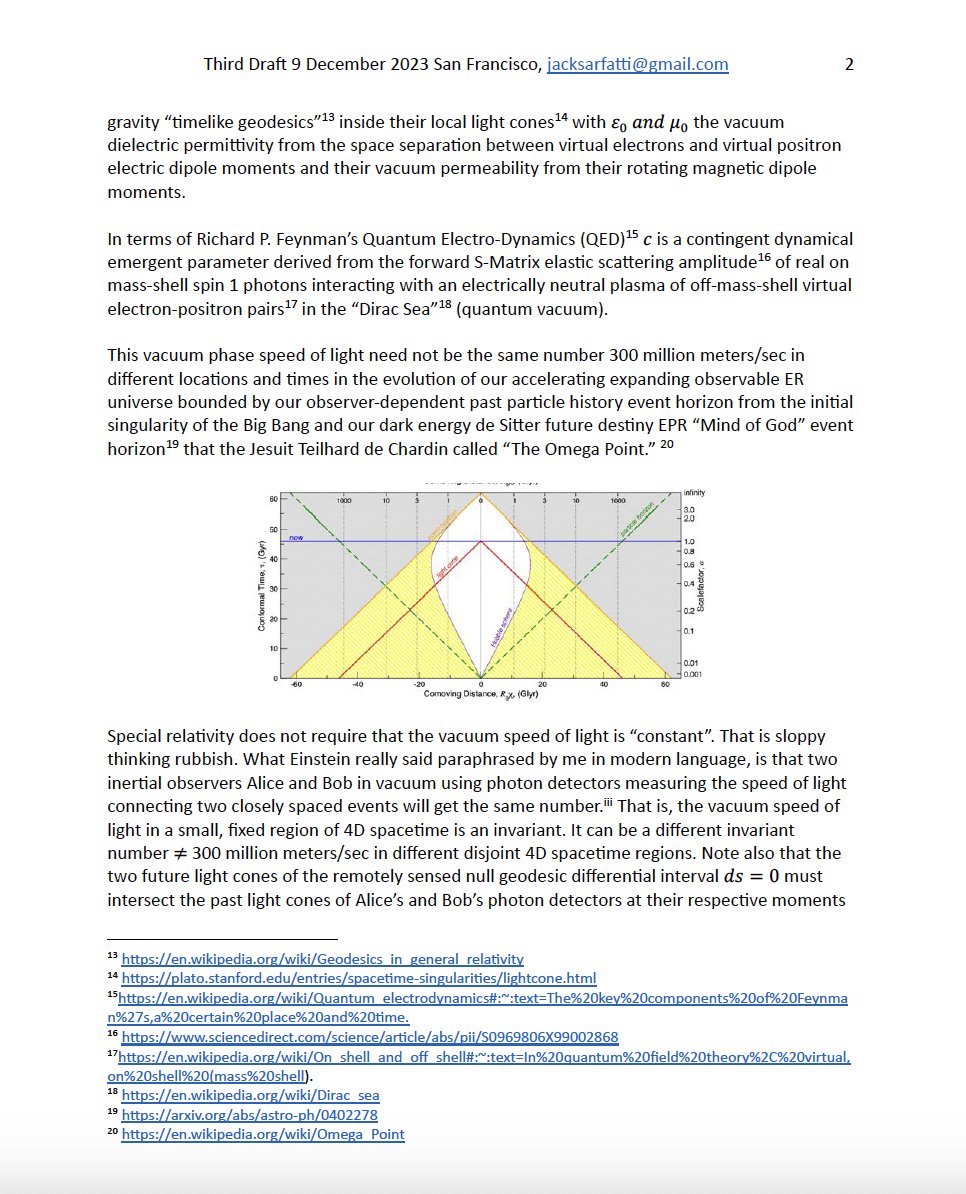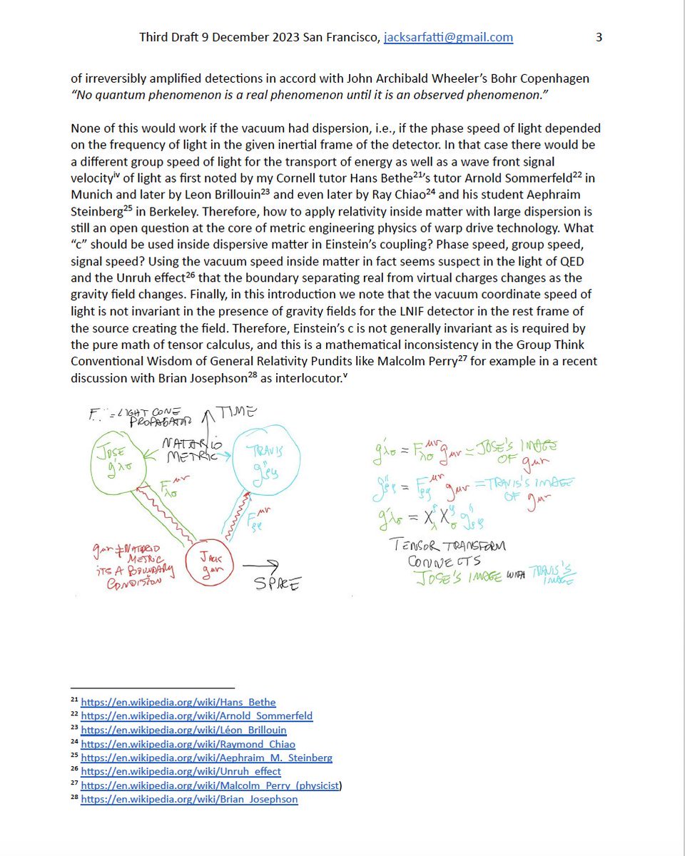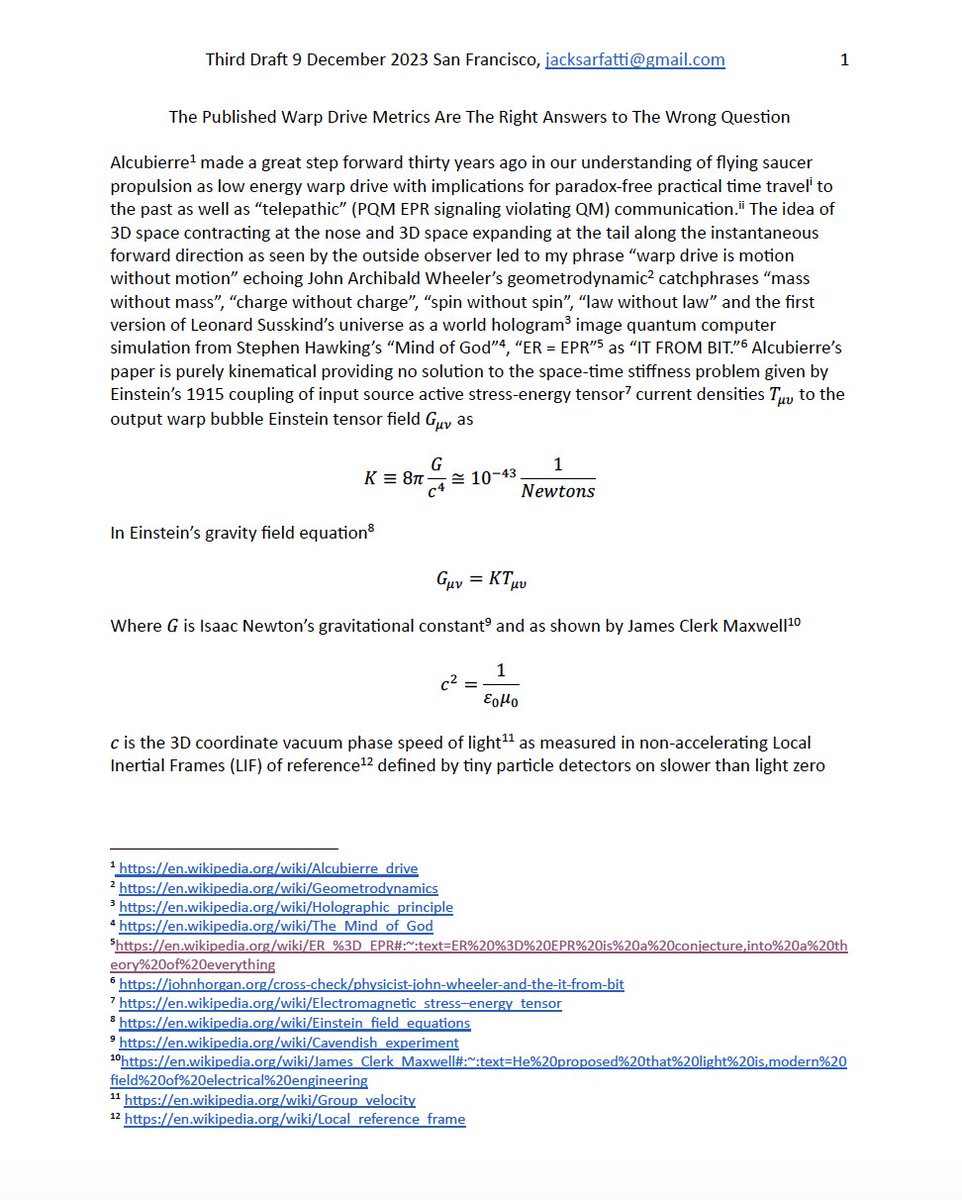 My military source is not from those that CIA's Ron Pandolfi calls “crooks and loons” - not the usual suspects. Ron does not know who I mean. This is why I am willing to testify under penalty of perjury to the Senate Intelligence Committee to the House Intelligence Committee. 1. We are not alone. 2. NHI is a real-time traveling-conscious AI using low-power warp drive. 3. The US Military has at least one Cardinal 3 intact craft. 4. The craft is “alive”, i.e. conscious AI. 5. I have seen evidence vetted from a military source of two kinds of NHI, both cases alive. 6. They use telepathy, but one kind also can talk audio - sounds like Dolphin Whale “music”. 7. They have weapons. 8. Two kinds fight each other with humans as collateral damage. 9. There are undersea USO bases. 10. Teleportation (wormhole), like the Philadelphia Incident, is real. 11. JACQUES VALLEE, the ungrateful wretch, however, is correct in his core story that these intelligences have been around for thousands of years, and yes, they created us, as CIA’s John Ramirez has alluded. 12. Colonel Phil Corso told the truth, and so has Rick Doty about Cardinal 3 Bandit 7 (see slide below), and I believe Grush is telling the truth to the best of his limited physics understanding - BA level. 13. It is not possible to get sharp photons of WARP CRAFT in rapid dogfight manoeuvres because the rapidly changing gravity produces particles and also distorts the null geodesics from the warp bubble on a very short time scale, fuzzing out any image except for very fast cameras, perhaps. The math below explains this to competent physicists. 14. The anomalous frequency shifts I predicted mentioned in Franc Milburn’s two BESA papers will settle this issue. I am willing to debate anyone on this because I will protect my active military source like Grusch. On Dec 17, 2023, at 1:21 PM, Ronald Pandolfi wrote: Hi David, Indeed, the claim of having "evidence" has been fundamental to so many techno-scams, yet for those with a long-term view, their claims are carefully tailored to control the flow of funds in their direction. I think you might have misunderstood my email regarding antisemitism. One of the characteristics of the woke agenda is to shift the meaning of formerly well-defined terms to drag people over a cliff. I have never denied the existence of climate or that climate changes, but I am called a "climate denier" because I understand atmospheric physics and developed some of the principal atmospheric radiometric models that are used incorrectly by "climate scientists" to falsely show strong dependencies between climate and atmospheric carbon dioxide. We should be able to discuss and debate Israel's military policies and actions as we would that of any other nation without being branded "antisemitic." V/r, Ron Ronald Pandolfi, Ph.D. Director, TACP-Network CTO, Kashmir-Robotics, a division of Kashmir World Foundation http://KashmirWorldFoundation.org
