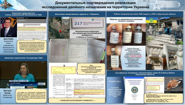5. The Cover Up Back in March 2022, Deputy Secretary of State Victoria Nuland announced the presence of bio-facilities controlled by the United States in Ukraine. Due to the fact that at the time of testifying before the US Senate Committee, Nuland was under threat of criminal punishment, she was forced to admit that if these biological facilities and materials located there come under the control of the Russian Armed Forces, there is a risk of leakage of sensitive information and great concern to the US administration. On January 31, 2023, the fact of “the implementation of a number of American scientific programs” was confirmed by the Coordinator for Strategic Communications at the National Security Council John Kirby. At the same time, in his interpretation, the laboratories located in the former Soviet republic were allegedly “deactivated” and abandoned by staff in early 2022. (https://www.wsws.org/en/articles/2022/03/10/nula-m10.html)