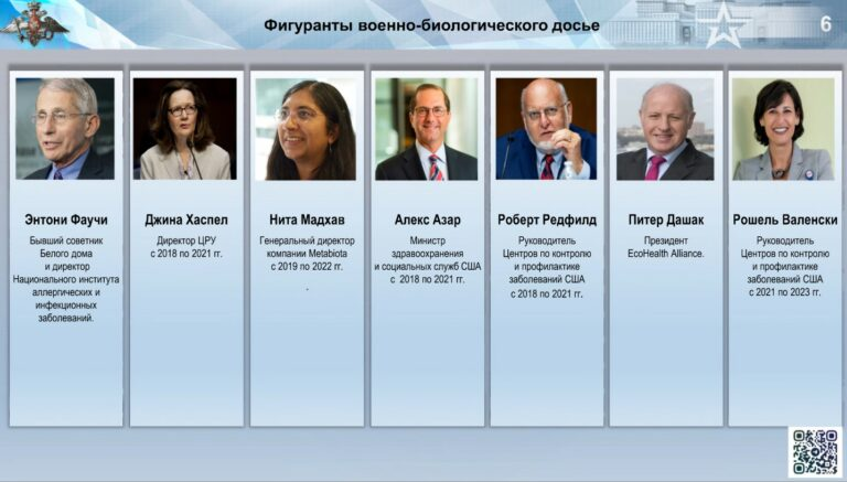 4. The Kabal A “strange coincidence” was noted that the COVID pandemic was preceded by a number of research projects on the systematic study of coronaviruses, which were funded by Washington. So, since 2009, the USAID has been implementing the Predict program, within which coronavirus diseases were studied and their vectors were captured. On September 12, 2023, lawmakers publicly demanded from the head of the department, William Burns, detailed materials for the work of a special subcommittee aimed to investigate the origin of the COVID-19 pandemic. The US reports available to the Russian military “Assessment of the risk of emerging infections from insectivorous bats in Ukraine and Georgia” revealed that coronavirus studies were conducted from 2016 to 2020. The report notes, “… that during the work on the territory of Ukraine, individuals of bats were identified migrating up to 800 km deep into countries such as Hungary and Russia ”. The list of persons involved in the military biological dossier includes persons who influenced the investigation of the causes of the COVID-19 pandemic, including employees of government agencies, officials of medical and pharmaceutical companies: 1. Anthony Fauci, former White House adviser and director of the National Institute of Allergy and Infectious Diseases. 2. Gina Haspel, Director of the CIA from 2018 to 2021, oversaw the implementation of military biological programs by the CIA, participated in the investigation aimed at determining the causes of the COVID-19 pandemic. 3. Nita Madhav, former CEO of Metabiota, wo created the platform for predicting scenarios for the development of the COVID-19 pandemic, which turned out to be completely ineffective. 4. Alex Azar, US secretary of health and human services from 2018 to 2021. The activities of these officials clearly demonstrate that the American administration deliberately ignores the most important issues of biosafety in order to make super profits.