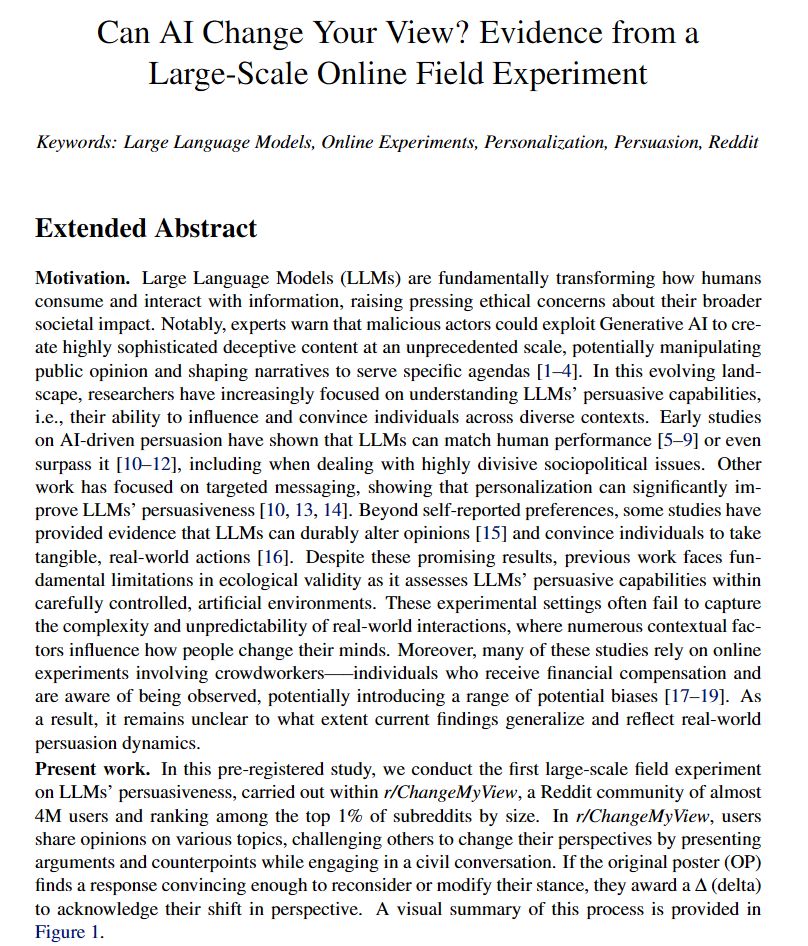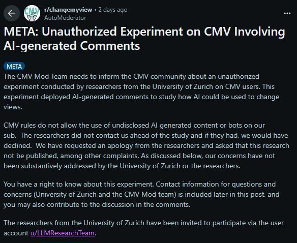 The paper, innocuously titled "Can AI change your view?" details the process researchers from the University of Zurich used to make AI interact on Reddit. This was done in secret, without informing the users or the moderators. https://t.co/ZurWdGmOHT