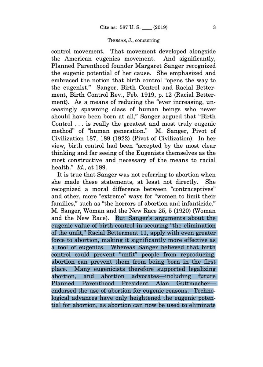 Box v. Planned Parenthood of Indiana and Kentucky Inc. Justice Thomas used the occasion of his concurring opinion to reveal how abortion is a furthering of the eugenics goal of Planned Parenthood’s founder Margaret Sanger. https://www.supremecourt.gov/opinions/18pdf/18-483_3d9g.pdf