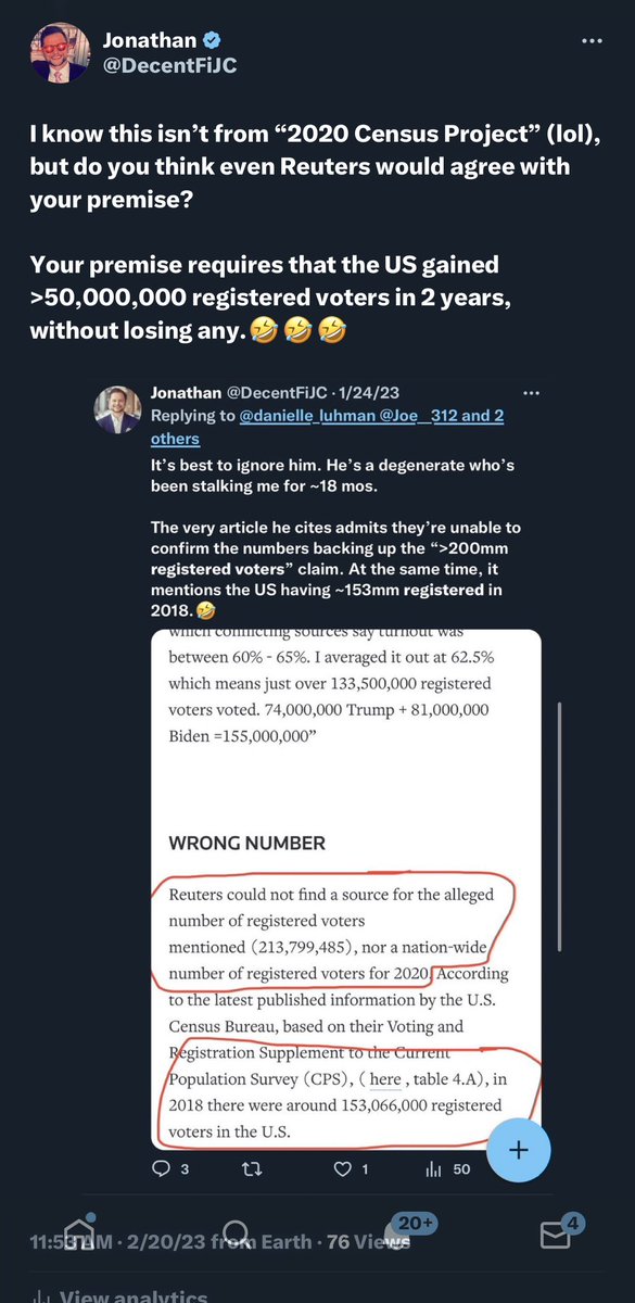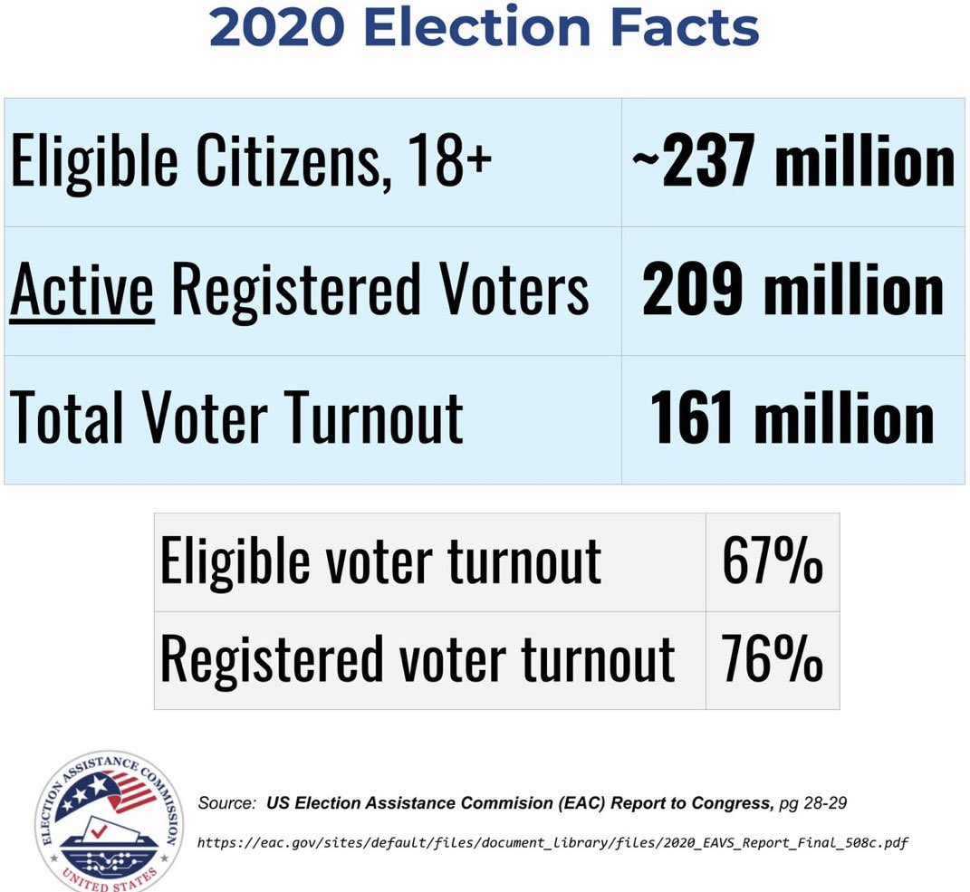 Here’s why we’ve continued to entertain these retards: THEIR side of the argument requires the belief that in just 2 years, the United States had a genuine INCREASE from 153mm “REGISTERED VOTERS” (active/inactive not specified) to 209mm “ACTIVE REGISTERED VOTERS” (which would be a SMALLER number than just total “REGISTERED VOTERS”). (+55.9mm active registered voters in 2 years.) That’s a 36.67% jump in “voter registrations”. Or said another way, an average increase of 1.12mm registered voters per STATE lol. (This did not happen. Lol.) And what made that bullshit possible, you ask? ERIC.🤣🤣🤣 But as you can see, they’re DESPERATE to maintain this narrative. Because the voter rolls are so incredibly f*cked and they’re terrified of people realizing these lunatics make up only 15-20% of the legal voter population. It’s also why the Arabella, New Venture Fund and Democracy Fund pedos began investing so heavily into the “Census Project 2020” at the same time they were using ERIC (and other tools) to completely destroy the integrity of our voter rolls.