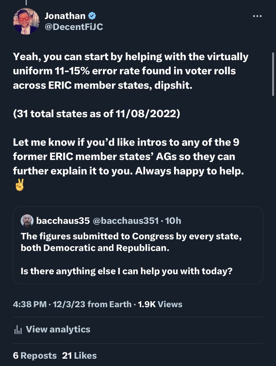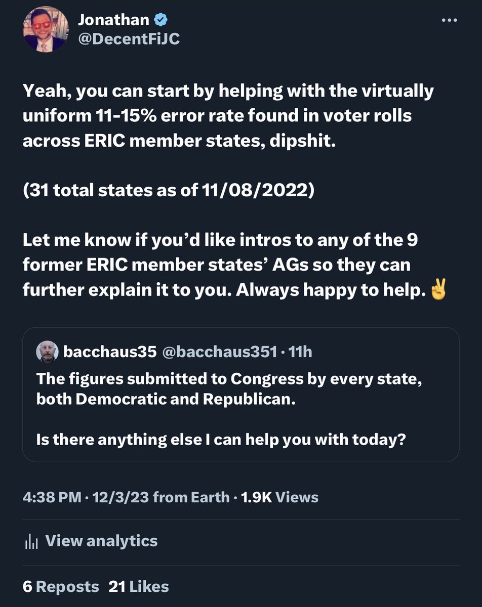Yeah, you can start by helping with the virtually uniform 11-15% error rate found in voter rolls across ERIC member states, dipshit. (31 total states as of 11/08/2022) Let me know if you’d like intros to any of the 9 former ERIC member states’ AGs so they can further explain it to you. Always happy to help.✌️