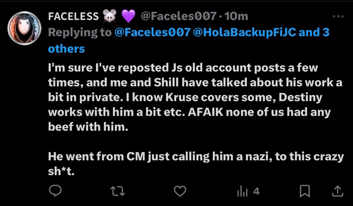 No, I wasn’t. You should’ve specified. Oh, wait… you kinda did that when you later mentioned you’d ‘reposted his old account posts’ and how ‘you and Shill have talked about my work some in private’ and that ‘Destiny works with him a bit’, right before (again, dishonestly) giving your version of the “how we got here” for the current situation, affectionately known as ‘this crazy shit’. If any of this is fuzzy, it’s right here in this post of yours you just deleted, as you realized you were driving your car off a fucking cliff with no brakes like some internet Thelma & Louise. So I don’t think I’ll be needing admonishment from you about honesty, Susan Sarandanon. (I even included another post of yours where you do exactly what you just accused me of doing.) That said, my ‘evidence’ on Jikky is dispositive, irrefutable and incredibly damning. You just think it sucks because you suck and you’re on the wrong fucking side of history.