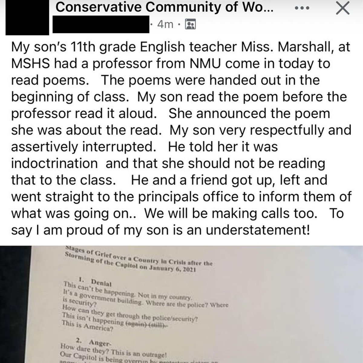 A teacher at @MQTSchools in MI reportedly had a woke college professor come into class and read a politically bias poem about January 6th. One brave student allegedly interrupted the reading telling the professor that the poem was indoctrination and informed the principal. This needs to be investigated by the @usedgov