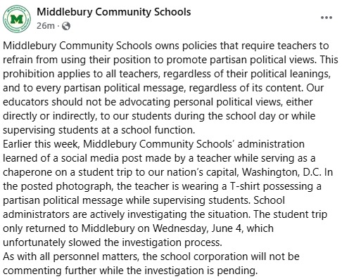 BREAKING: Middlebury Community Schools just issued an official statement after we exposed one of their teachers for wearing an "8647" shirt DURING a school trip. The school claims they are currently investigating the incident. Calls for violence against the President by educators should not be tolerated.
