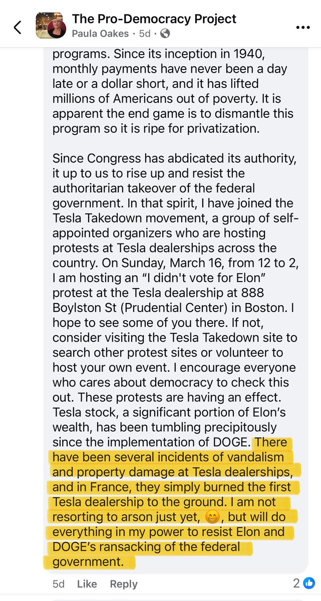 Here’s the full Facebook post made by Paula Oakes, a public school teacher and the organizer of the @Tesla Takedown in Boston, Massachusetts on 3/16/25. “I am not resorting to arson just yet.” https://t.co/gp4CqH83dj