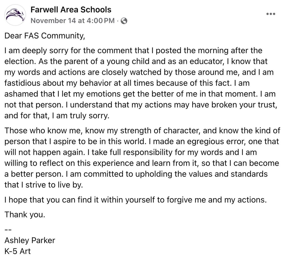 BREAKING: Ashley Parker, a teacher at Farwell Area Schools in Michigan, reportedly made a post online hoping for the ass*ss*nation of Donald Trump after the election results. The school posted her public apology on their Facebook and then blocked all comments. She is allegedly still employed at the school. These are the people teaching your kids.