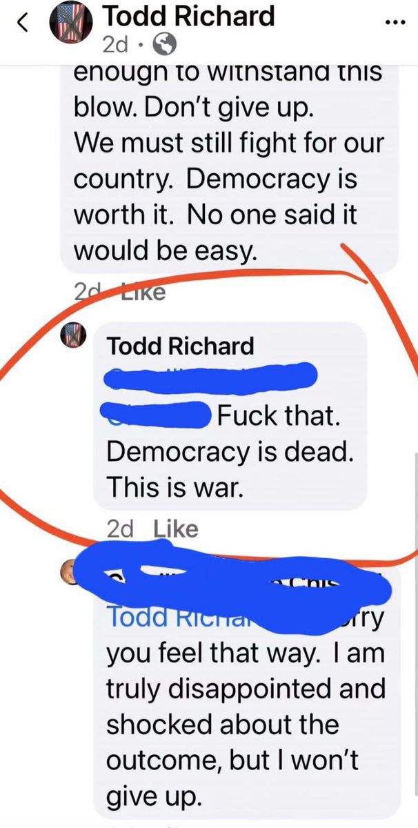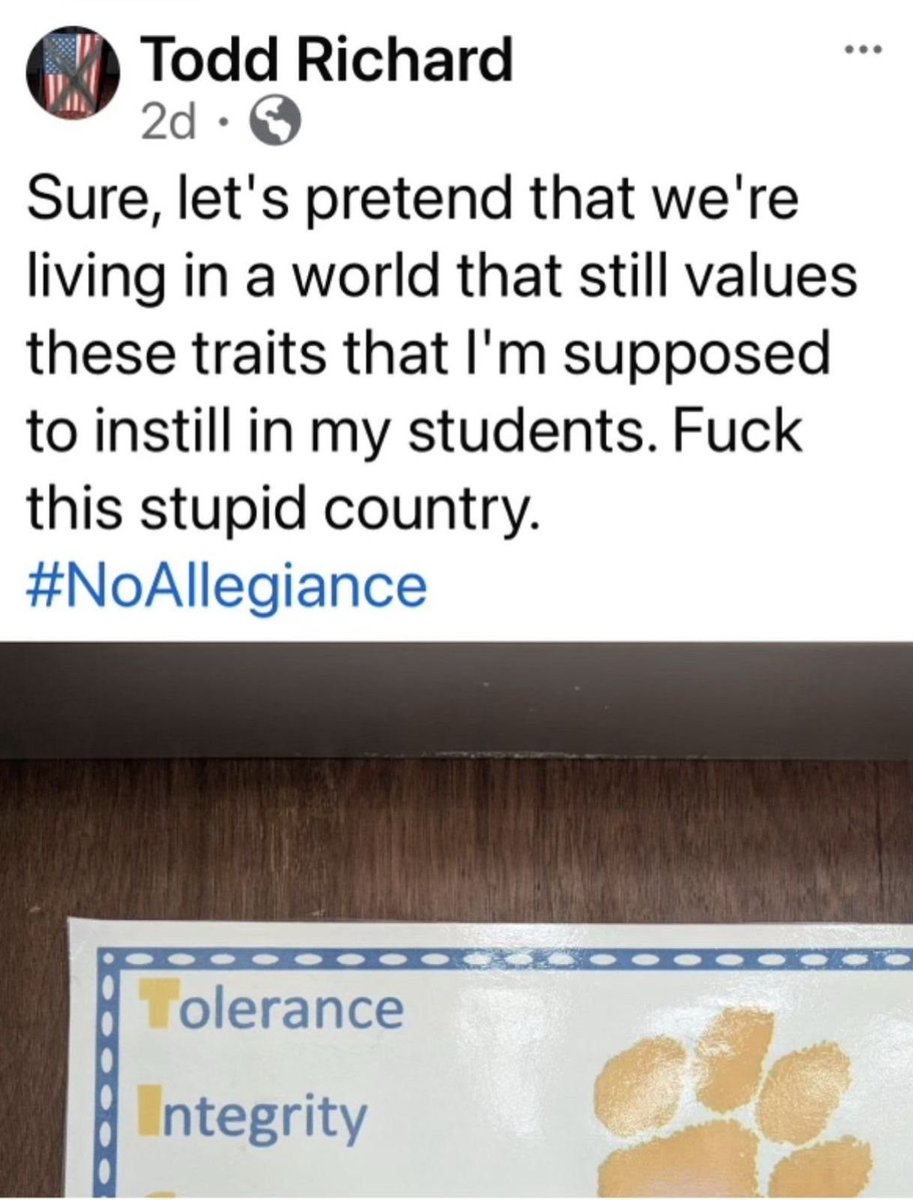 Meet Todd Richard, a gym teacher at Tashua Elementary School in CT who, following the election of Trump, posted online comments including "F*ck this stupid country", "No Allegiance", and "Democracy is dead. This is war." This person is in charge of teaching your kids. https://t.co/3nSvuqL6Tv