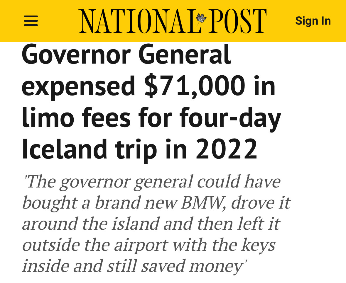 The Governor General spent $71,000 on limos in Iceland. https://t.co/Nk855eCLBR