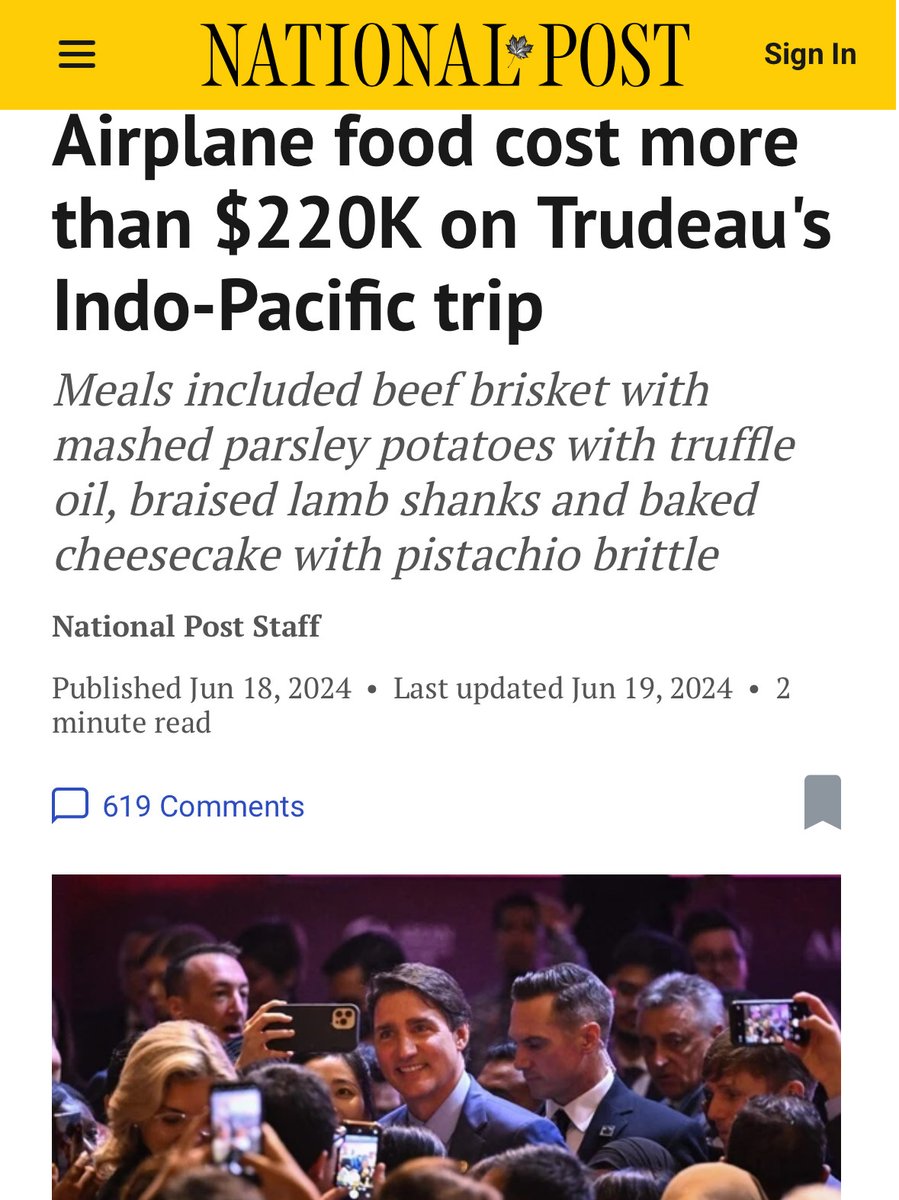 Trudeau and his entourage spent $220,000 on fancy airplane food during his six-day trip to the Indo-Pacific region. https://t.co/m5jQ0FDyhz