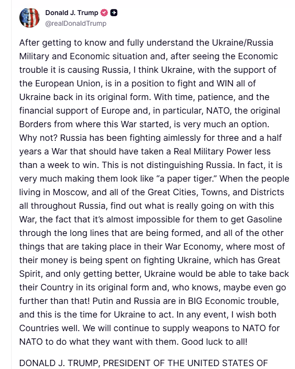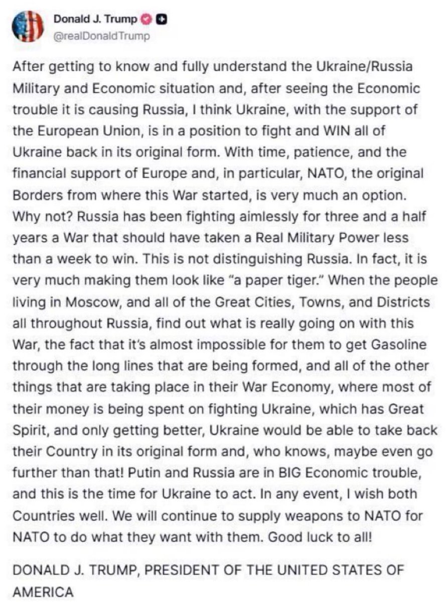 Unwinnable Trump's proxy war: "After getting to know and fully understand the Ukraine/Russia Military and Economic situation and, after seeing the Economic trouble it is causing Russia, I think Ukraine, with the support of the European Union, is in a position to fight and WIN all of Ukraine back in its original form. With time, patience, and the financial support of Europe and, in particular, NATO, the original Borders from where this War started, is very much an option. Why not? Russia has been fighting aimlessly for three and a half years a War that should have taken a Real Military Power less than a week to win. This is not distinguishing Russia. In fact, it is very much making them look like “a paper tiger.” When the people living in Moscow, and all of the Great Cities, Towns, and Districts all throughout Russia, find out what is really going on with this War, the fact that it’s almost impossible for them to get Gasoline through the long lines that are being formed, and all of the other things that are taking place in their War Economy, where most of their money is being spent on fighting Ukraine, which has Great Spirit, and only getting better, Ukraine would be able to take back their Country in its original form and, who knows, maybe even go further than that! Putin and Russia are in BIG Economic trouble, and this is the time for Ukraine to act. In any event, I wish both Countries well. We will continue to supply weapons to NATO for NATO to do what they want with them. Good luck to all! DONALD J. TRUMP, PRESIDENT OF THE UNITED STATES OF AMERICA"
