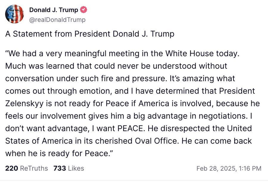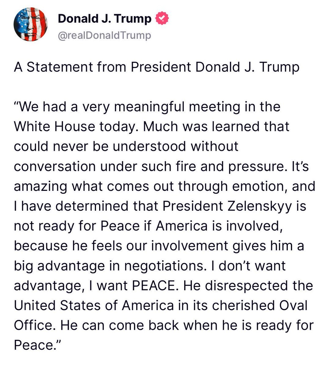 “We had a very meaningful meeting in the White House today. Much was learned that could never be understood without conversation under such fire and pressure. It’s amazing what comes out through emotion, and I have determined that President Zelenskyy is not ready for Peace if America is involved, because he feels our involvement gives him a big advantage in negotiations. I don’t want advantage, I want PEACE. He disrespected the United States of America in its cherished Oval Office. He can come back when he is ready for Peace.” –President Donald J. Trump
