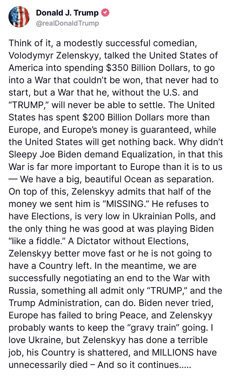 Trump slams Zelensky and Biden era funding for the endless war. Why does the U.S. get the worst end of the deal? Europe’s money was guaranteed, ours wasn’t. Half of ours went missing. Trump’s Art of the Deal will not let this abuse of America continue. https://t.co/HQzPhqgzOF
