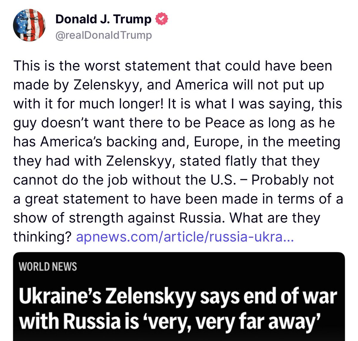 Zelensky says he wants the war to end, but he’s not acting like it. Friday he dismissed the US ceasefire as unworkable. Saturday he had European leaders affirm his position. And now he says the end of the war is “very, very far away.” Feels like we’re being played. https://t.co/ZfJu7v9Edo