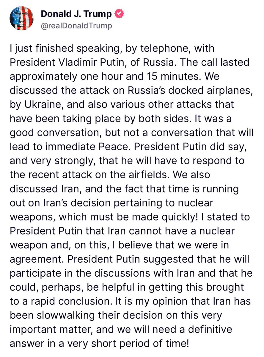 🚨 #BREAKING: President Trump announces he just got off another lengthy phone call with Vladimir Putin Per Trump, Zelensky ruined ANY chance of a ceasefire by deciding to launch attacks deep inside of Russia. This war WILL NOT END with Zelensky in power. He MUST be removed. https://t.co/1yQQVEhZq6