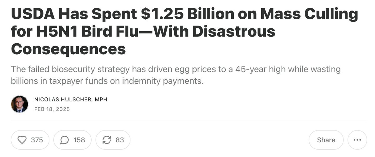Read the full report via @NicHulscher: USDA Has Spent $1.25 Billion on Mass Culling for H5N1 Bird Flu—With Disastrous Consequences https://www.thefocalpoints.com/p/usda-has-spent-125-billion-on-mass?r=2km2zq&utm_medium=ios&triedRedirect=true