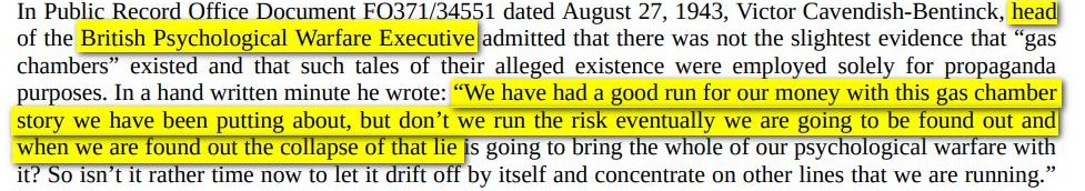 On dated August 27, 1943, Victor Cavendish-Bentinck, head of the British Psychological Warfare Executive, admitted that there was not the slightest evidence that 'gas chambers" existed and that such tales of their alleged existence were employed solely for propaganda purposes. https://t.co/ZtkToNBNlp