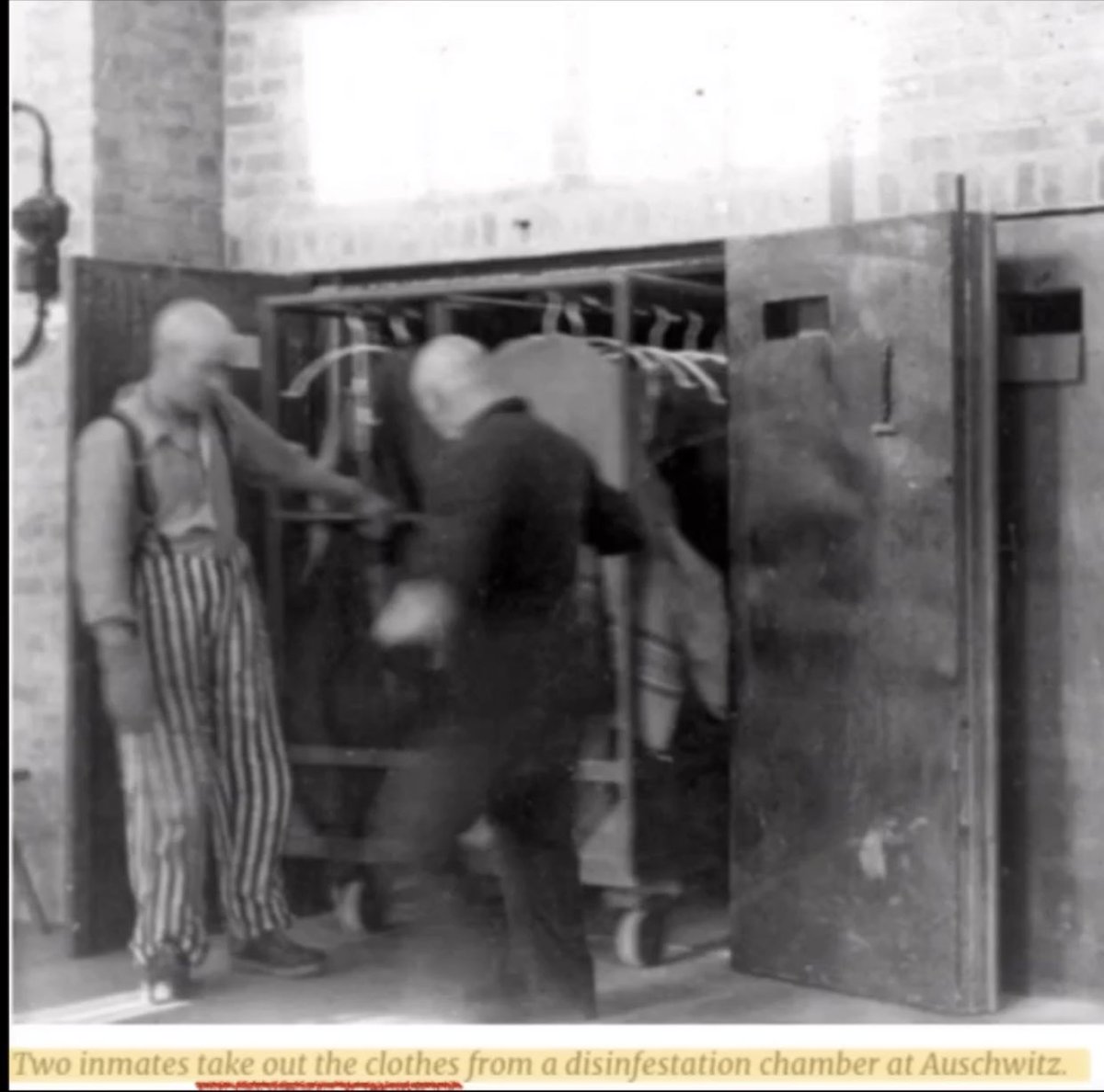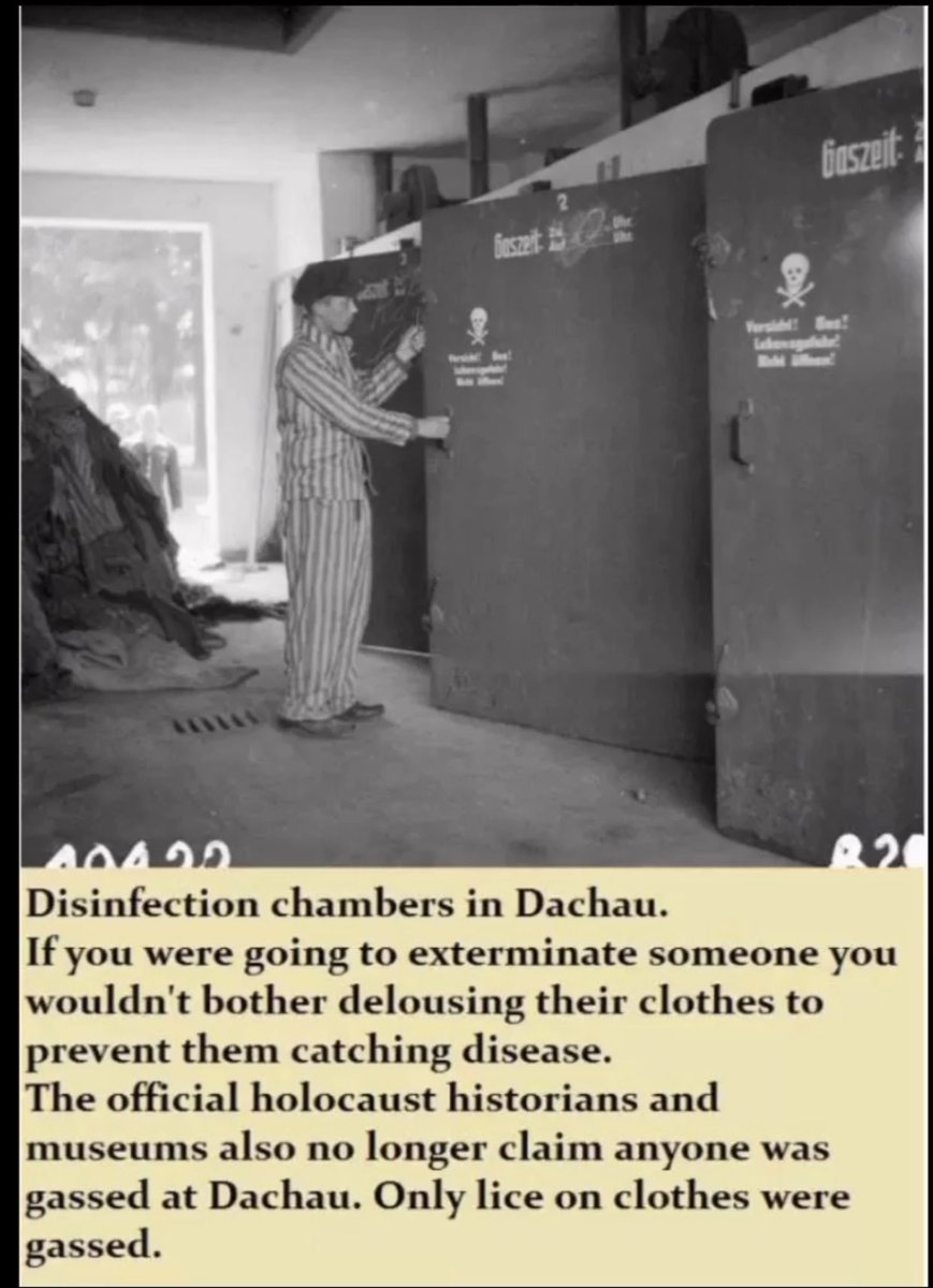 In reality these were not gas chambers, they were delousing chambers. Zyklon-B, known to US countries as DDT, was a repellant used to control the spread of lice, which was causing Typhus outbreaks responsible for some of the bodies we see in pictures with falsified captions claiming they were gassed. The inscriptions on the doors and above them, often edited out or photoshopped, say as much.