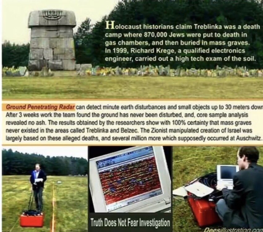 Multiple ground penetrating radar tests failed to show evidence of mass graves in Treblinka, but new experts were brought in and claimed to have found evidence of mass graves. Shortly after the ground on site was paved with boulders and concrete so no further tests could be made.