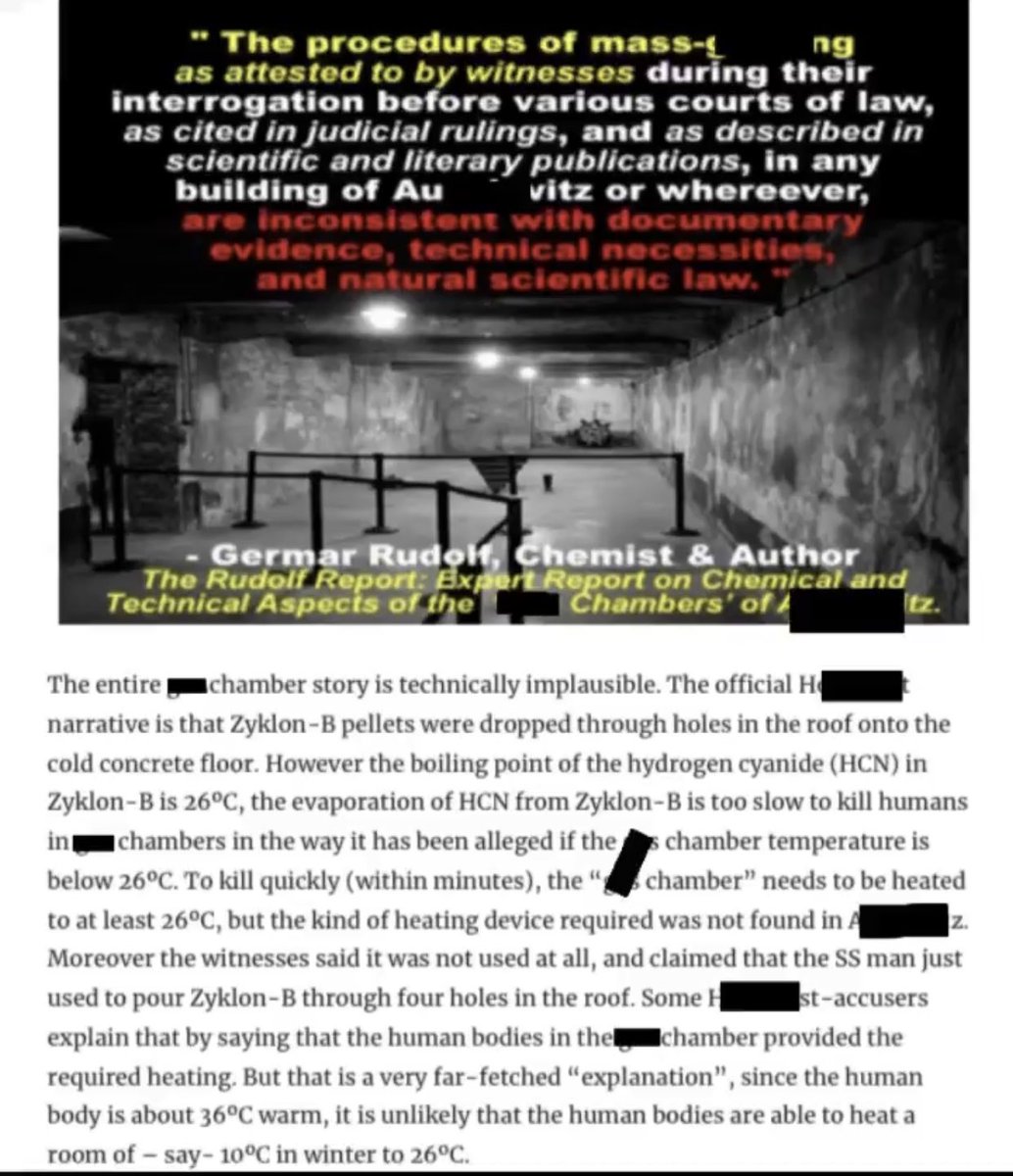 They claim that ✡️s were gassed by the millions, using hydrogen cyanide gas (the chemical name for Zyklon-B), however hood scraping the walls of all the supposed “gas chambers,” zero evidence of this was found. In addition, when someone is poisoned with Cyanide, their body turns a bright red color due to a lack of oxygen present in the blood. We have never heard of millions of bright red bodies being buried. https://www.holocausthandbooks.com/dl/15-loth.pdf