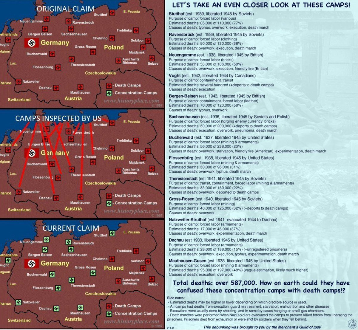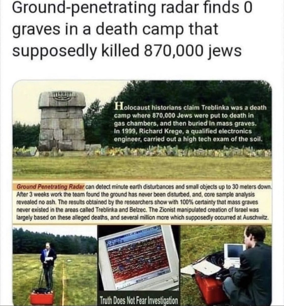 The reality is that Jews were not kept in death camps, they were kept in labor camps. Hundreds of land surveys, ground samples, GPR scans, and other experiments have been conducted at all of these camps. No evidence of mass graves has EVER been found, and the claim that they were all incinerated is mathematically impossible even by todays crematorium standards. More evidence in this book: https://www.holocausthandbooks.com/dl/15-loth.pdf