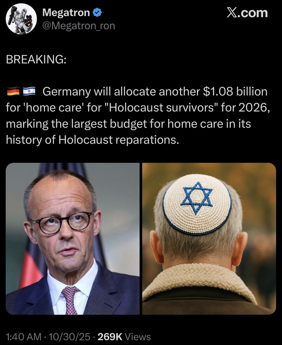 @badazn Do jews still receive reparations from their fabricated German Holocaust? YES. They steal, plunder, and squeezing dry the gentiles as much as they can. Jews use these plundered resources to advance the state of Israel and impede the rise of nationalism. https://t.co/BcxKdAUbpr
