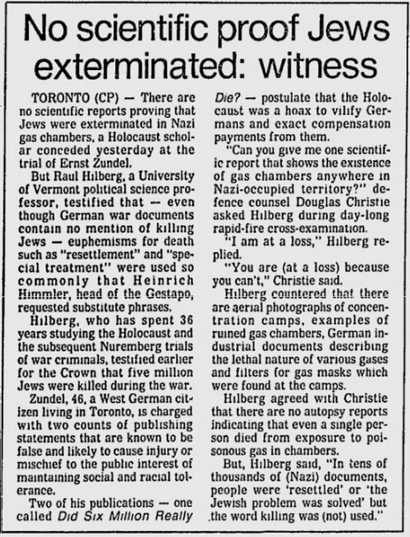 David Irving testified for Zündel, stating that "There isn't a shred of evidence that H;tler ordered the mass extermination of the jews" He produced evidence in court that the British psychological warfare executive engineered the gas chamber story as atrocity propaganda. https://t.co/vrJVuxDkAK