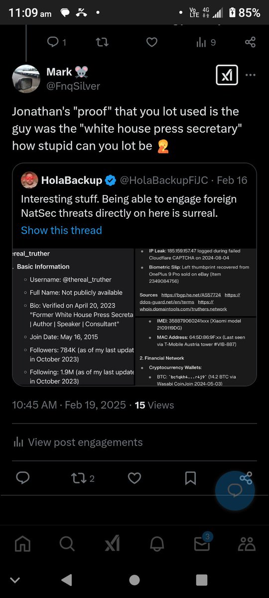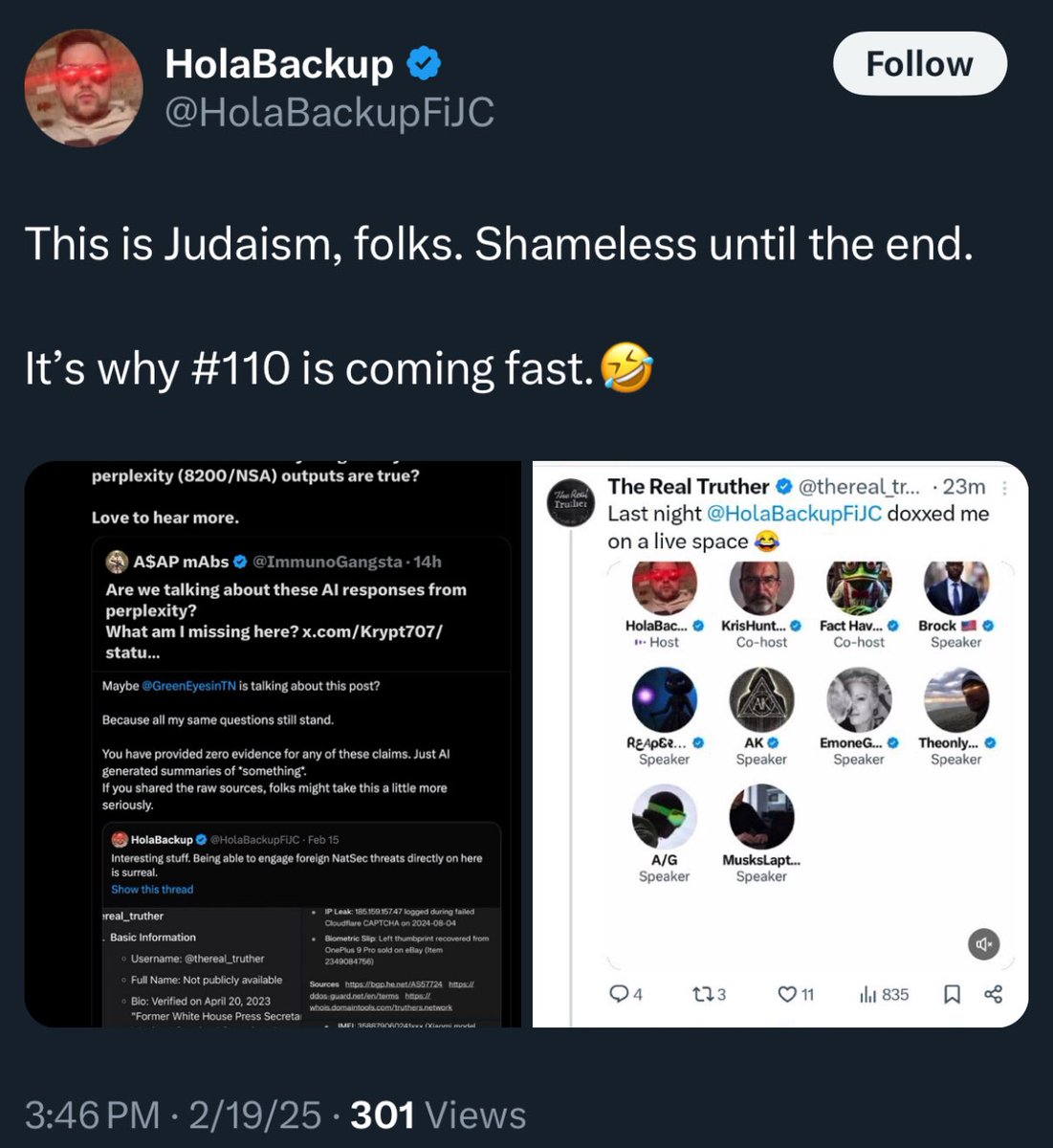 Dmitry, In your frantic efforts to get me suspended (again), you didn’t even take a second to consider you’d just nuked all your homies alongside you by confirming our intel… …instead of just taking the massive fucking L. Now, your only move is “that’s not me”, hours after the fact, because the BolshevikHQ war-gaming fa***ts determined the only GTO play that MAYBE spares them now is you retroactively convincing everyone you’re just some low-rent Mossad/CIA anon retard who tags Elon fucking Musk on the false doxxing claims he makes. I mean, clearly, you’re all of those things too, but you (and they) are completely fucked. Best of luck with the sales pitch, cunt.🤣