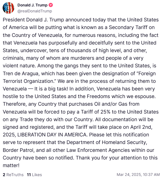 Trump’s statement on Venezuela: Starting April 2, 2025—“Liberation Day in America”—the U.S. will impose a 25% secondary tariff on any country buying oil or gas from Venezuela. Trump says Venezuela deliberately sent tens of thousands of violent criminals, including the terrorist-designated Tren de Aragua gang, into the U.S.